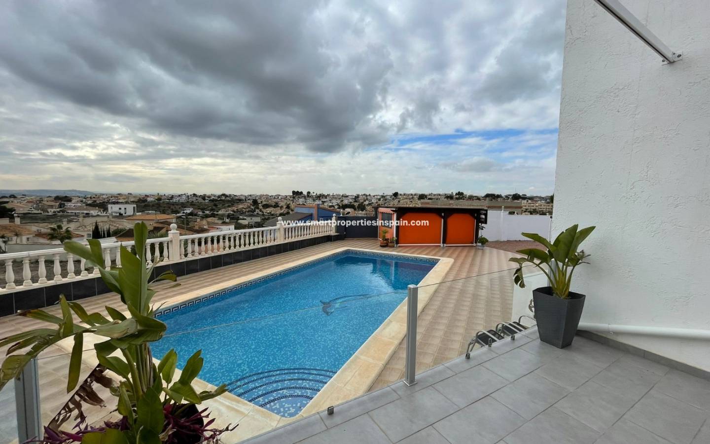 Das Grundstück erstreckt sich über zwei Ebenen, wobei sich die geräumige, moderne Villa auf der oberen Ebene befindet und einen herrlichen Blick über die Dächer und die Berge der Region bietet. Das Anwesen verfügt über einen riesigen privaten Pool von 10 x 4,5 m und daneben eine überdachte Bar und einen Sitzbereich, was es zu einem großartigen sozialen Raum für Partys mit Familie und Freunden macht und perfekt ist, um köstliche Mahlzeiten im Freien in der mediterranen Luft mit einer Aussicht zu genießen, die Sie fallen lässt verliebt.