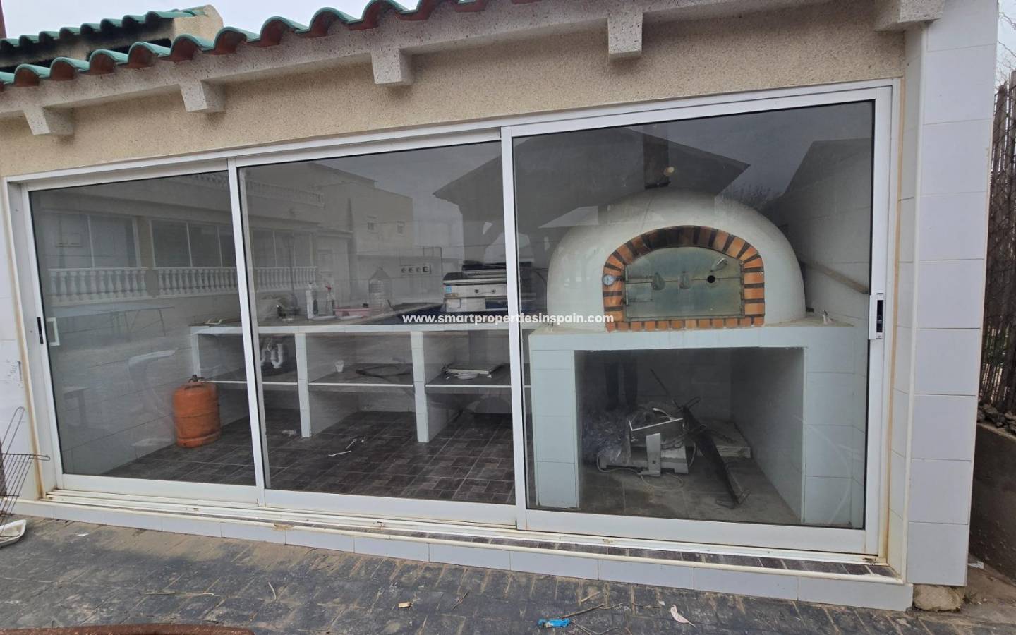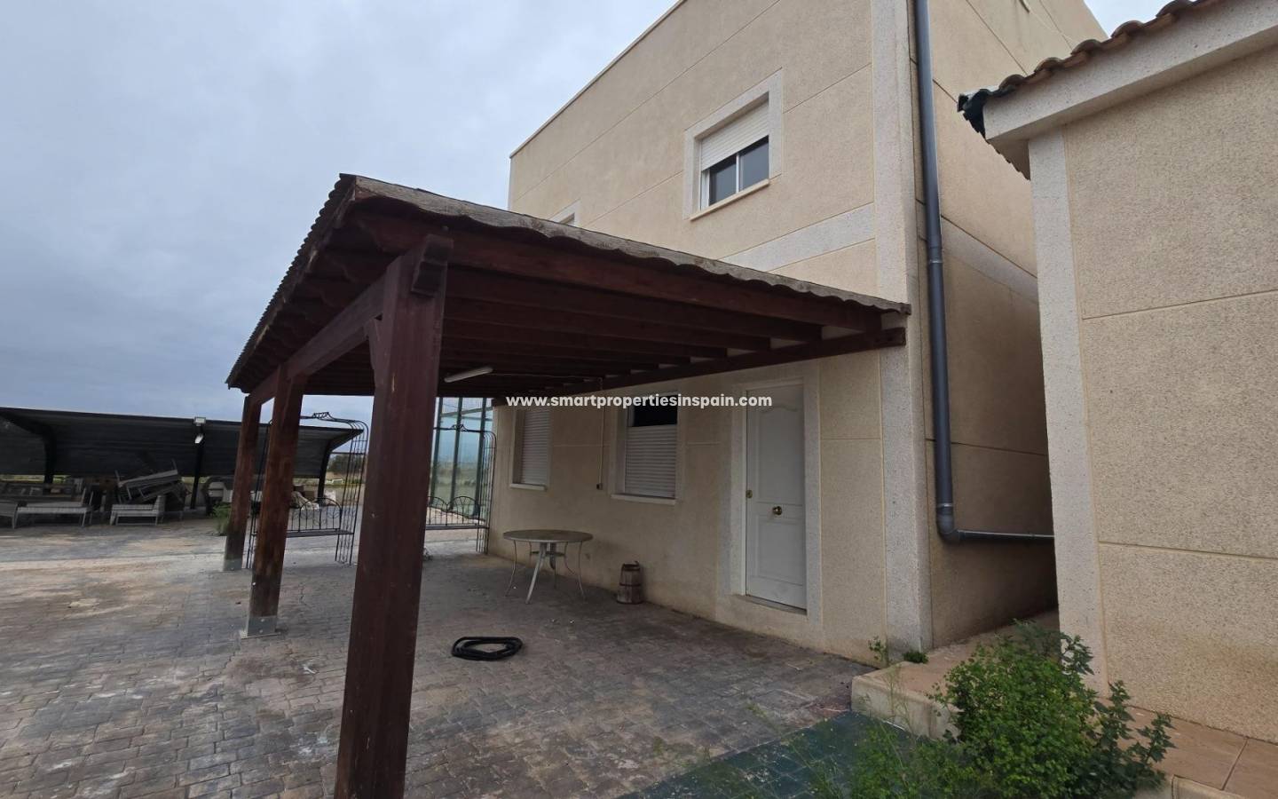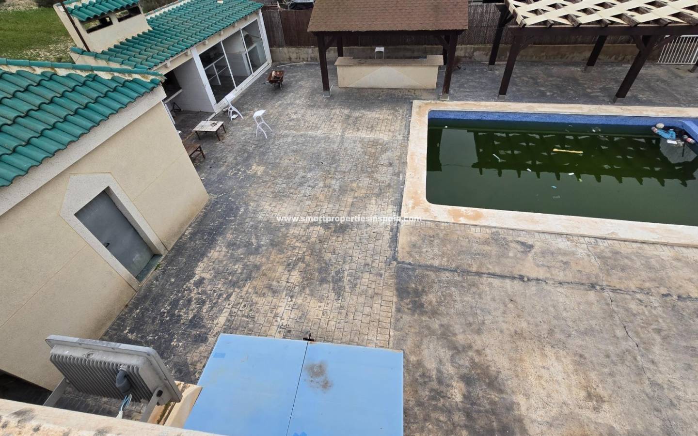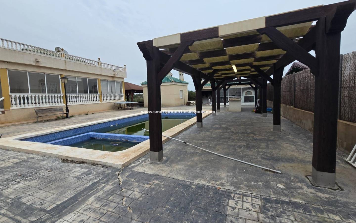 ZWEI UNABHÄNGIGE HÄUSER, EINES HAT 3 SCHLAFZIMMER UND ZWEI BADEZIMMER, EINES EN-SUITE, WOHNZIMMER UND KÜCHE MIT HOHEN DECKEN, SWIMMINGPOOL UND GUTER GRILL, MIT EINEM GROSSEN HOLZDACH VON CA. 40 METERN FÜR KÜHLE SOMMERABENDE, Das andere Haus ist unten offen gestaltet und verfügt über ein Badezimmer und im Obergeschoss gibt es eine weitere Etage mit 3 Schlafzimmern und darüber ein Solarium mit spektakulärer Aussicht, Villa im Viertel La Marina, La Marina, 320 m² Fläche, 2000 m2. Grundstück, 5000 m vom Strand entfernt, 2 Doppelschlafzimmer und 4 Einzelschlafzimmer, 4 Badezimmer, renoviertes Anwesen, nur Küchenmöbel, weiß lackierte Innenschreinereiarbeiten, Steinzeugboden, Außenschreinereiarbeiten aus Aluminium/Climalit.