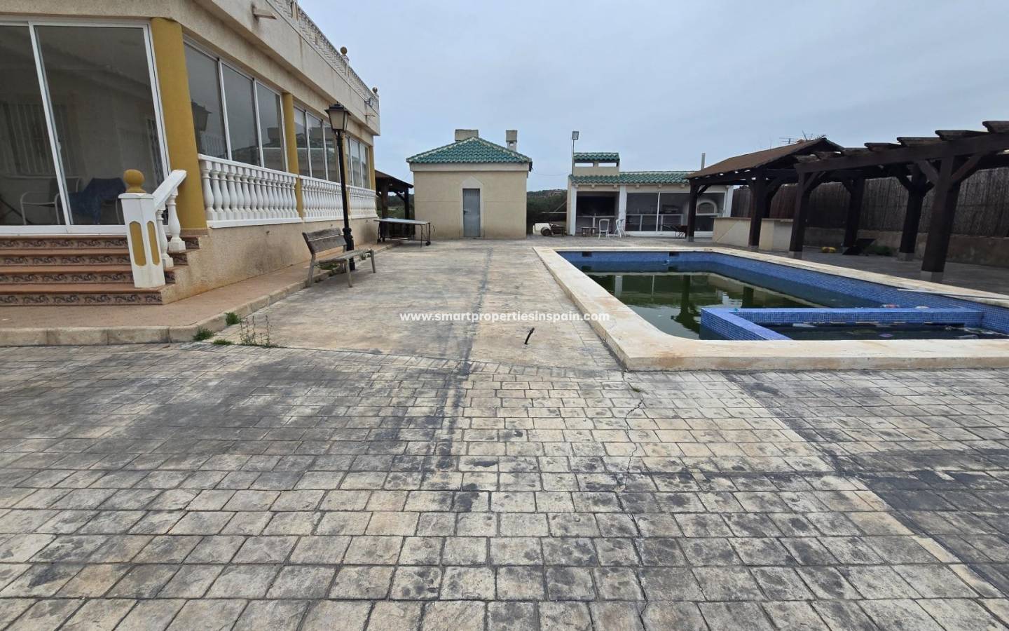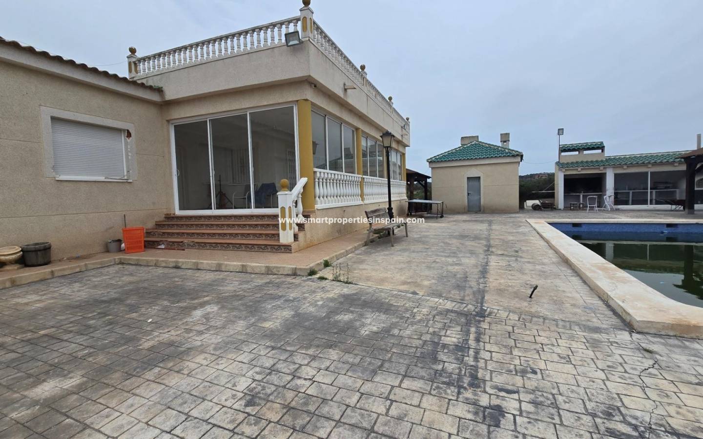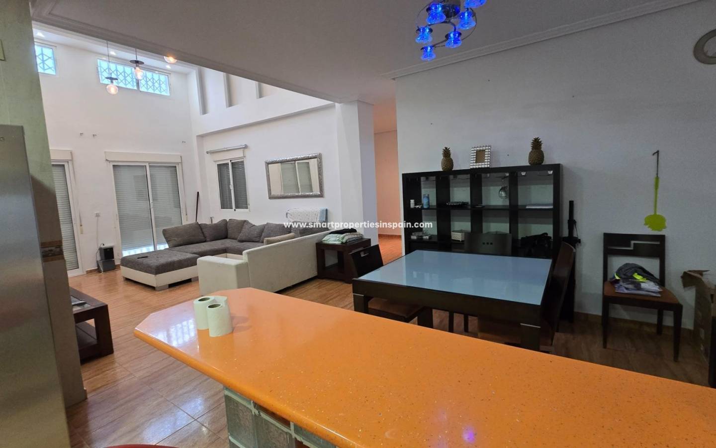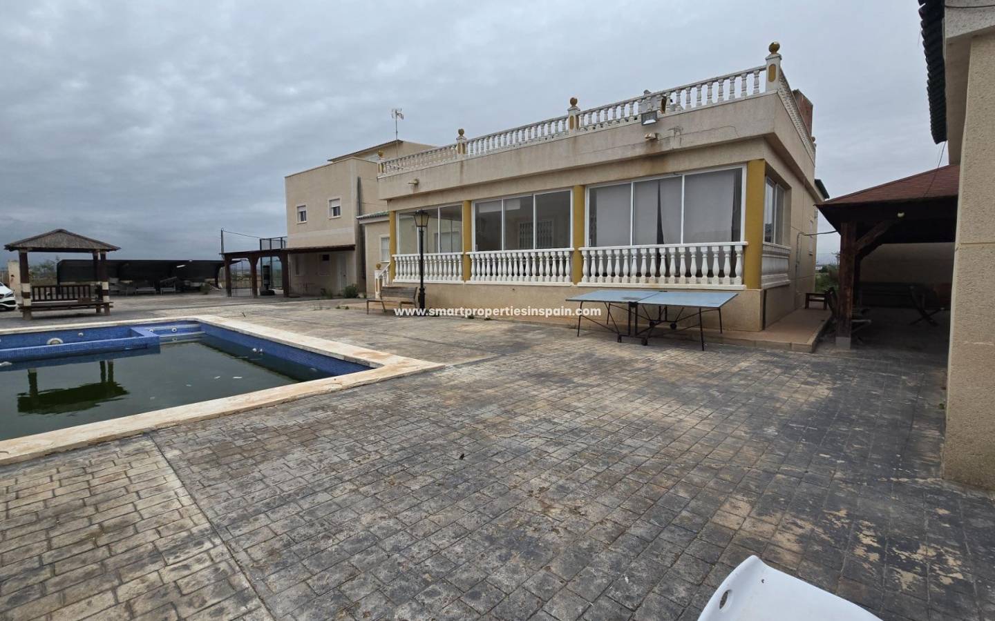ZWEI UNABHÄNGIGE HÄUSER, EINES HAT 3 SCHLAFZIMMER UND ZWEI BADEZIMMER, EINES EN-SUITE, WOHNZIMMER UND KÜCHE MIT HOHEN DECKEN, SWIMMINGPOOL UND GUTER GRILL, MIT EINEM GROSSEN HOLZDACH VON CA. 40 METERN FÜR KÜHLE SOMMERABENDE, Das andere Haus ist unten offen gestaltet und verfügt über ein Badezimmer und im Obergeschoss gibt es eine weitere Etage mit 3 Schlafzimmern und darüber ein Solarium mit spektakulärer Aussicht, Villa im Viertel La Marina, La Marina, 320 m² Fläche, 2000 m2. Grundstück, 5000 m vom Strand entfernt, 2 Doppelschlafzimmer und 4 Einzelschlafzimmer, 4 Badezimmer, renoviertes Anwesen, nur Küchenmöbel, weiß lackierte Innenschreinereiarbeiten, Steinzeugboden, Außenschreinereiarbeiten aus Aluminium/Climalit.