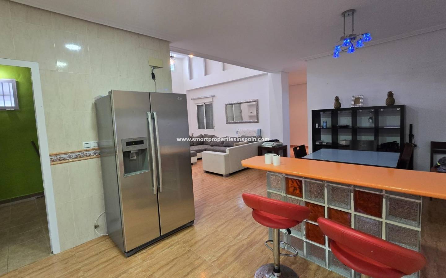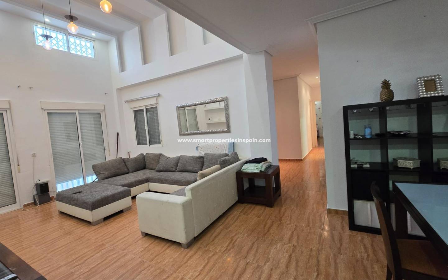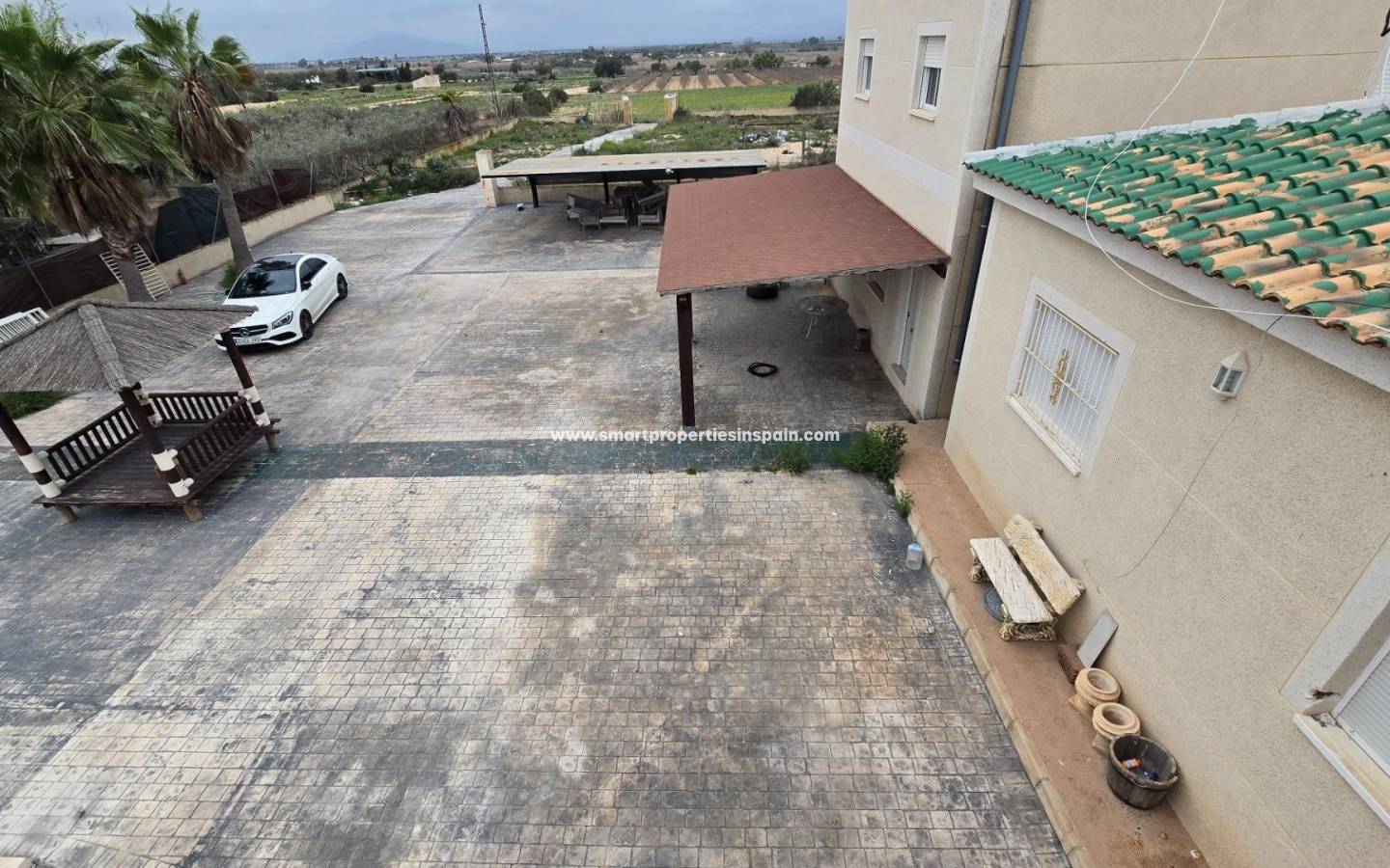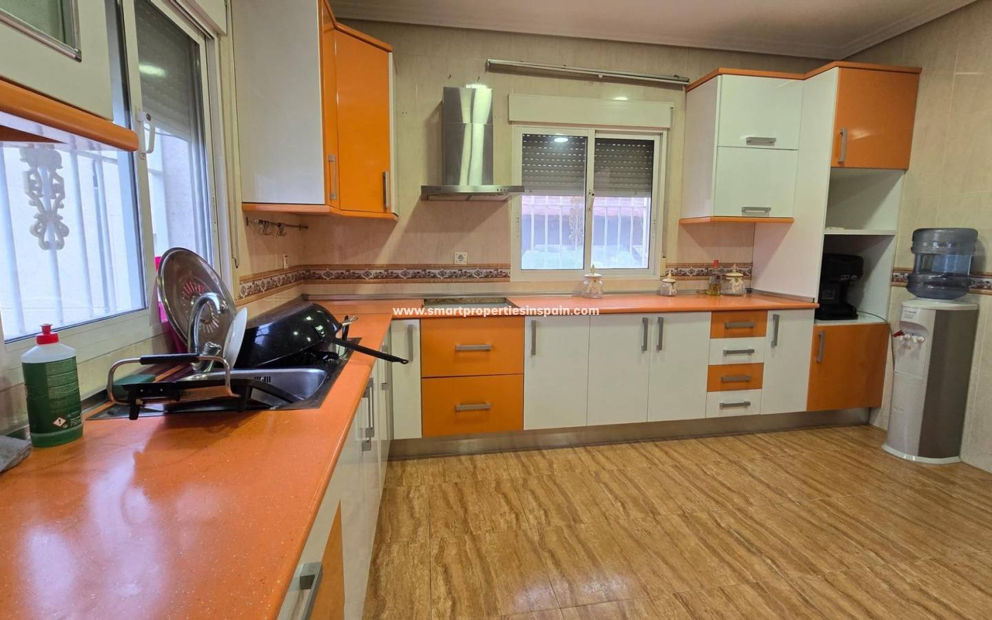 ZWEI UNABHÄNGIGE HÄUSER, EINES HAT 3 SCHLAFZIMMER UND ZWEI BADEZIMMER, EINES EN-SUITE, WOHNZIMMER UND KÜCHE MIT HOHEN DECKEN, SWIMMINGPOOL UND GUTER GRILL, MIT EINEM GROSSEN HOLZDACH VON CA. 40 METERN FÜR KÜHLE SOMMERABENDE, Das andere Haus ist unten offen gestaltet und verfügt über ein Badezimmer und im Obergeschoss gibt es eine weitere Etage mit 3 Schlafzimmern und darüber ein Solarium mit spektakulärer Aussicht, Villa im Viertel La Marina, La Marina, 320 m² Fläche, 2000 m2. Grundstück, 5000 m vom Strand entfernt, 2 Doppelschlafzimmer und 4 Einzelschlafzimmer, 4 Badezimmer, renoviertes Anwesen, nur Küchenmöbel, weiß lackierte Innenschreinereiarbeiten, Steinzeugboden, Außenschreinereiarbeiten aus Aluminium/Climalit.
