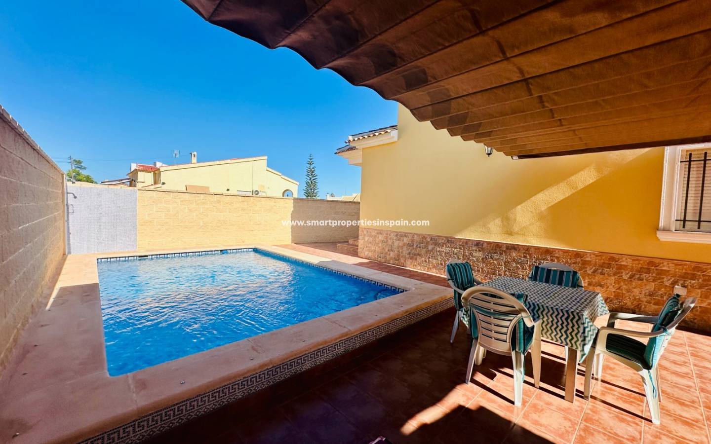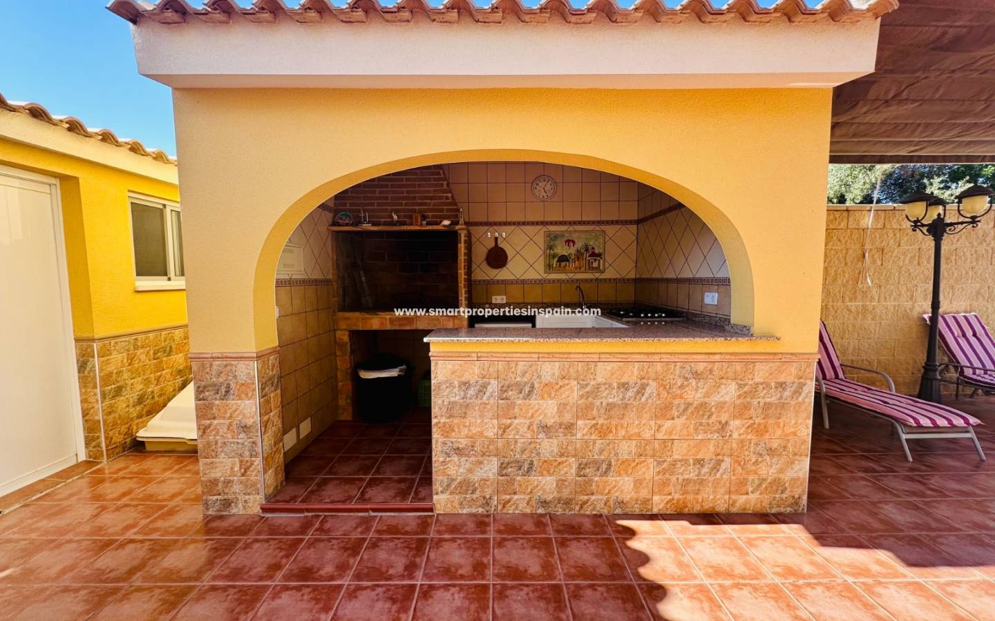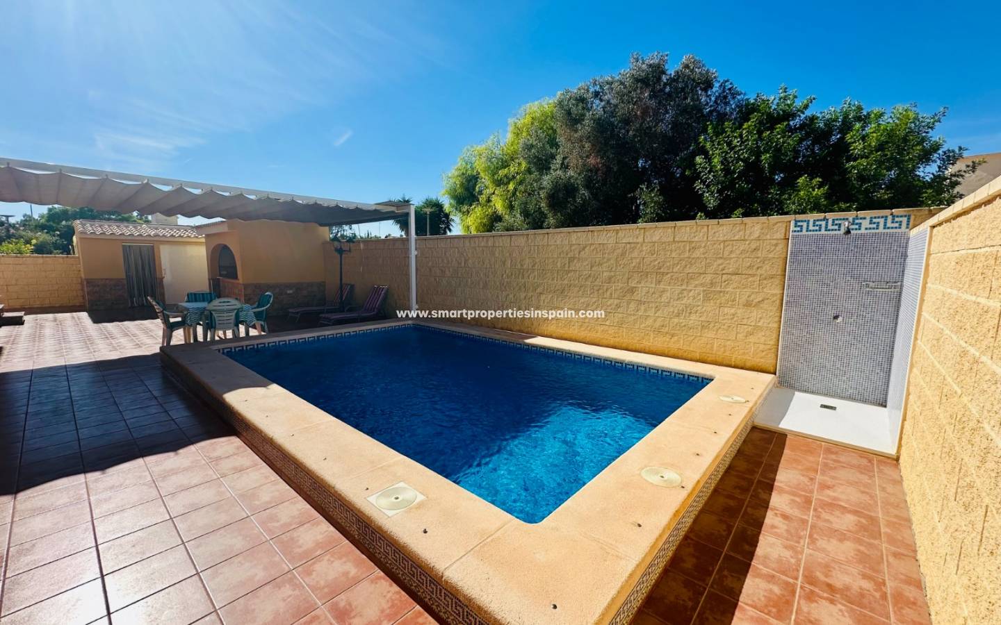 Draußen gibt es einen idealen Platz, um das Leben im Freien zu genießen, mit einer Außenküche/Grill, 1 Badezimmer, Pergola, privatem Pool mit Außendusche, Abstellraum und ausreichend Parkplätzen auf dem Grundstück .