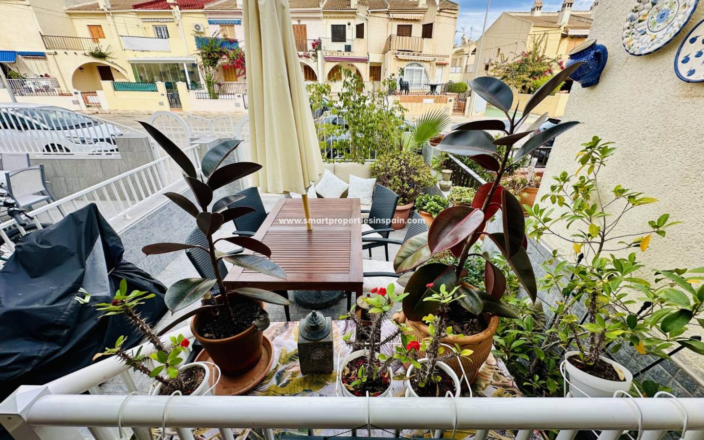Smart Properties freut sich, Ihnen dieses charmante Ein-Zimmer-Haus in der schönen Wohnanlage Buenavista in Guardamar, nur 600 Meter vom Strand entfernt, anbieten zu können. Die Wohnfläche beträgt ca. 53 m². Im Erdgeschoss befinden sich eine Terrasse, eine Veranda mit Abstellraum, ein Wohnzimmer mit Kamin und eine offene Küche. Eine Marmortreppe führt ins Obergeschoss mit einem kleinen Abstellraum, einem Familienbad mit ebenerdiger Dusche, einem Schlafzimmer mit Einbauschränken und neuen, französischen Aluminiumtüren mit Fensterläden, die auf einen Balkon mit freiem Ausblick führen. Wohnzimmer und Schlafzimmer sind mit einer Klimaanlage ausgestattet.