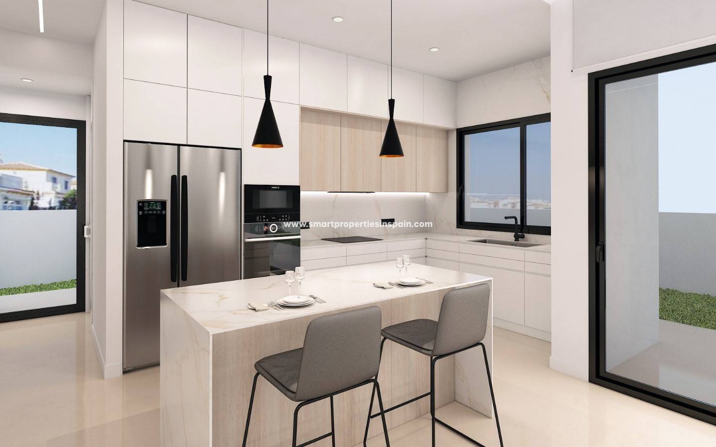 Das Haus bietet 140 m² Wohnfläche, die sich praktisch und hell auf einem 526 m² großen Grundstück verteilen. Es verfügt über drei geräumige Schlafzimmer, zwei Badezimmer und eine moderne, offene Küche, die mit dem Wohn- und Essbereich verbunden ist und so einen großzügigen und einladenden Raum schafft – ideal für Familienleben und gesellige Abende.
