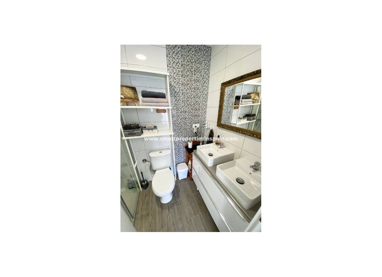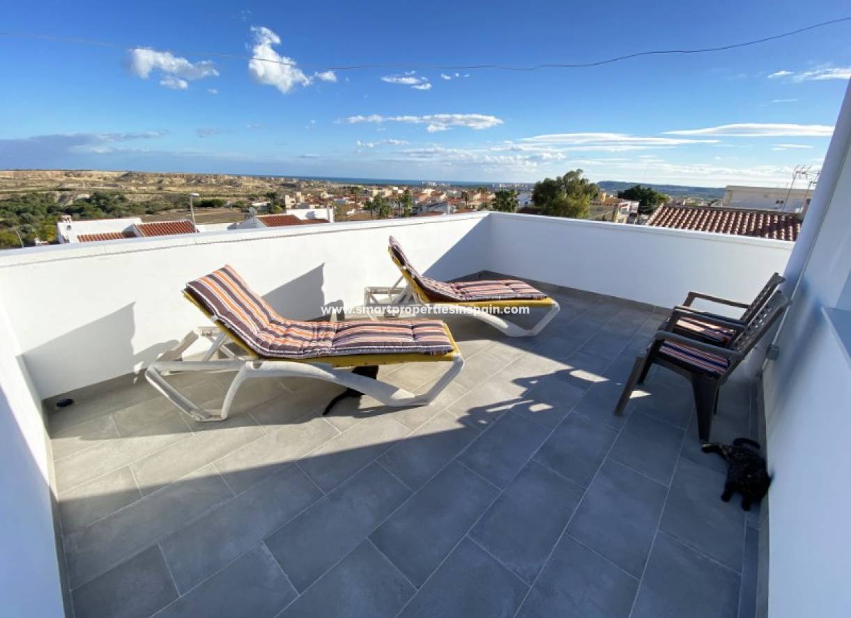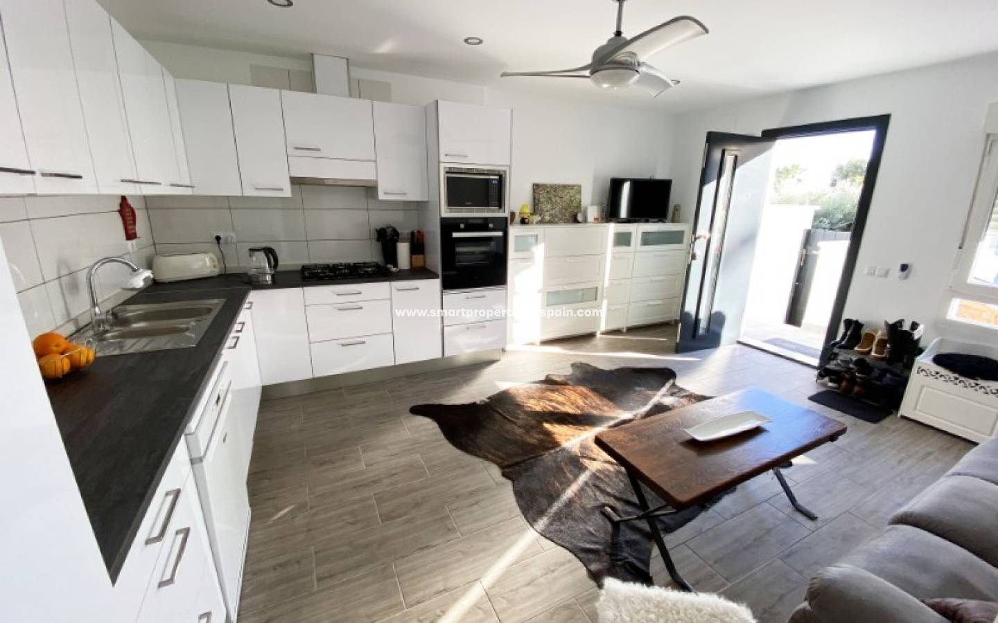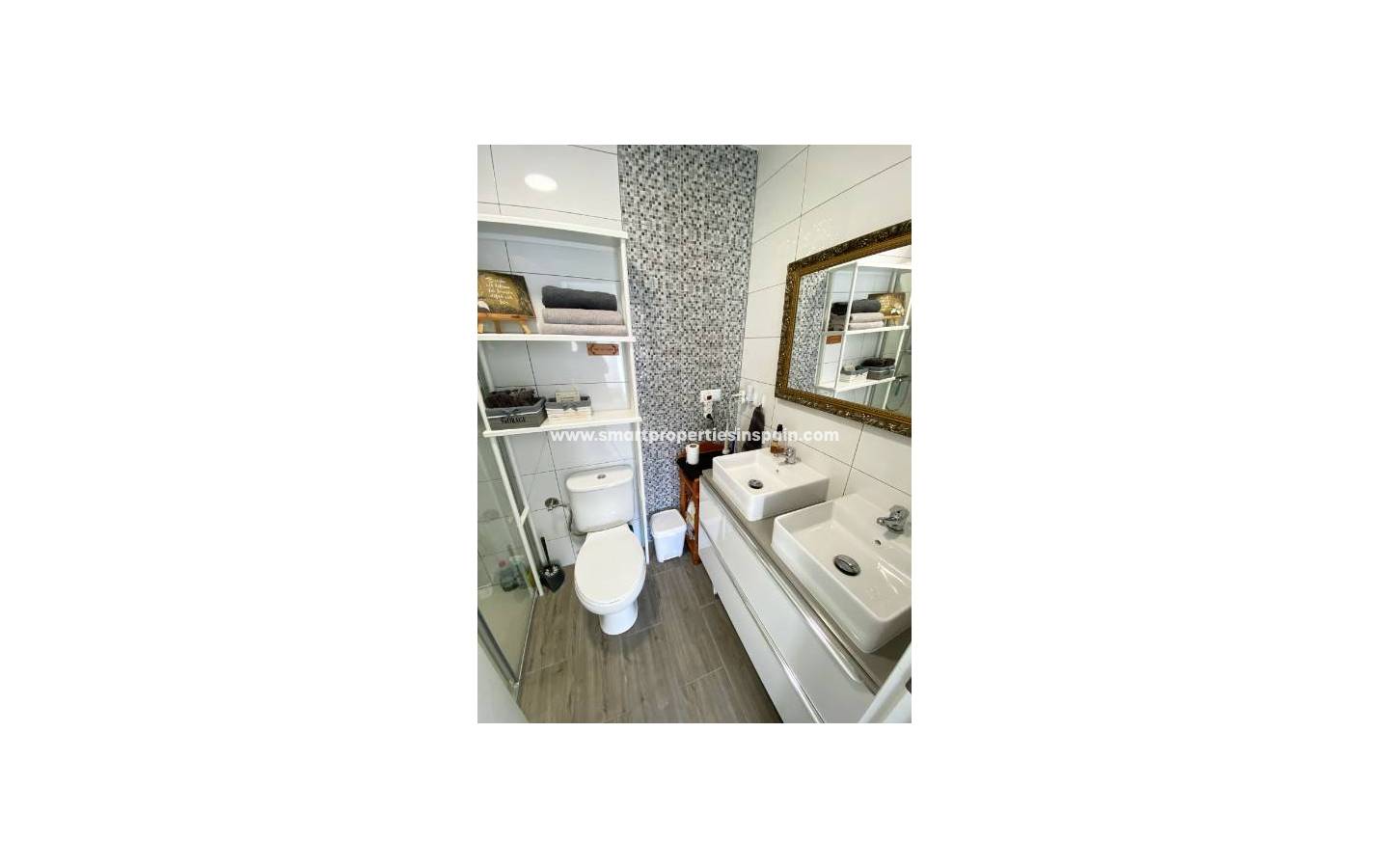 Esta hermosa casa adosada con orientación sur ofrece 2 dormitorios, 2 baños/wc y se encuentra en la urbanización La Marina, a solo 20 minutos en coche del aeropuerto de Alicante.