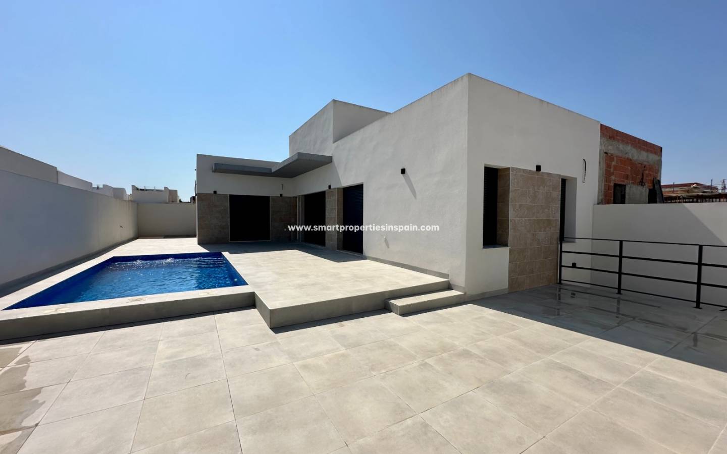 Casa semi adosada de obra nueva, todo en una planta, facilitando la vida cotidiana, la parcela es Amplia, con suficiente espacio para disfrutar del aire libre, Piscina Privada, Perfecta para refrescarse y relajarse en la privacidad de tu propio jardín, el aparcamiento es privado dentro de una parcela