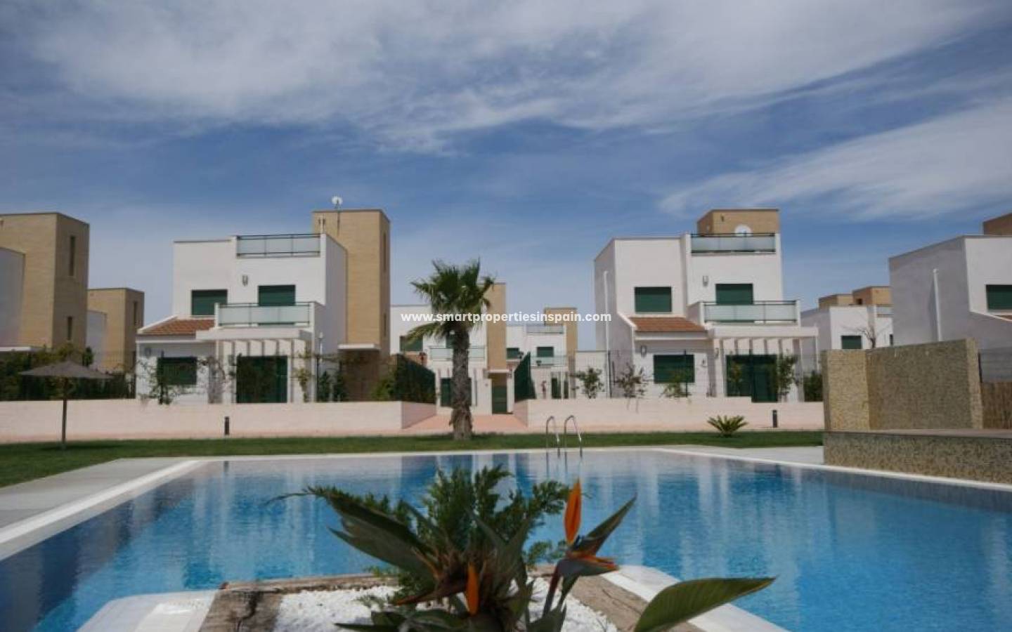 Belle villa moderne sur 2 étages. Salon/salle à manger ouvert avec portes-fenêtres sur la terrasse, cuisine séparée avec electromenagers. Salle de bain au rez-de-chaussée et chambre double. Terrasse pour les repas à l´exterieur. A l'étage: 2 chambres doubles, une avec portes-fenêtres donnant sur balcon. Jardins communautaires et piscine. Aire de jeux pour enfants, solarium sur le toit avec vue sur la mer!