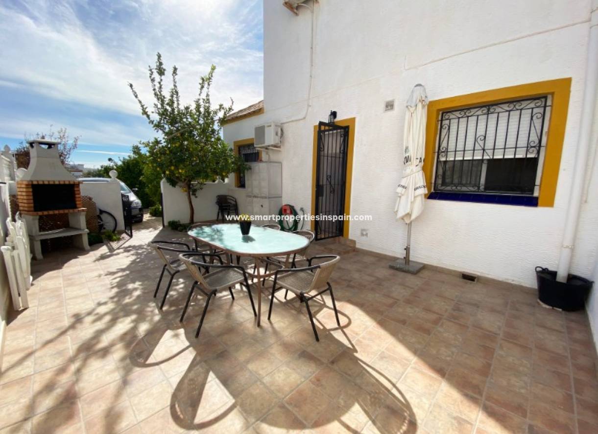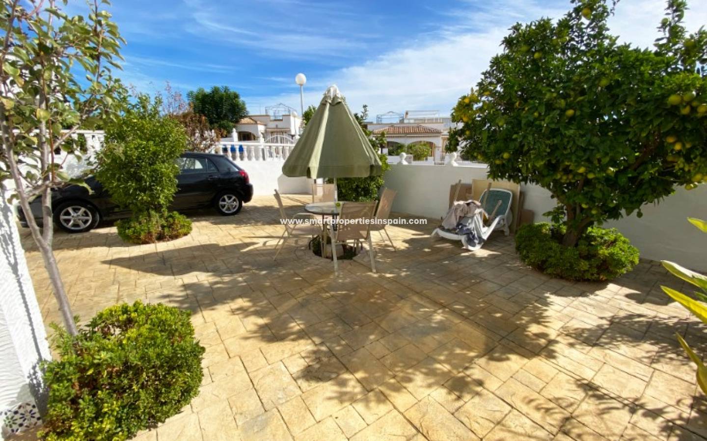 À l'extérieur, le jardin est entièrement carrelé, quelques arbres, plantes et arbustes, un beau grand espace pour les repas en plein air. La villa se trouve à seulement quelques pas de la piscine commune avec jardin
