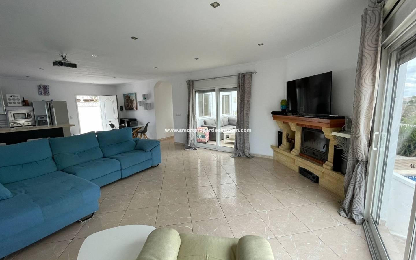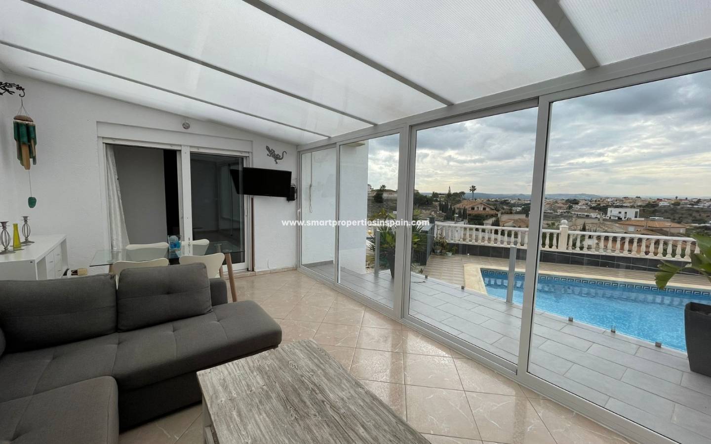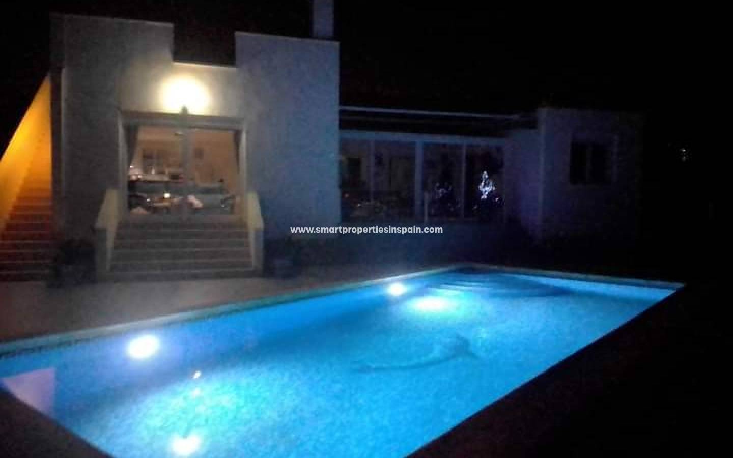 Les vues continuent dans la maison et dès que vous entrez, vous voyez les vues directement sur la piscine, il y a une cuisine ouverte, moderne et lumineuse de très bonne taille, entièrement équipée avec un coin repas qui s'ouvre sur un très spacieux, séjour lumineux qui dispose d'une cheminée, d'une grande TV mais aussi d'un projecteur de cinéma avec un écran de 3m pour regarder des films. Deux ensembles de portes coulissantes baignent la pièce avec la lumière du soleil, l'un a des escaliers menant à la piscine, l'autre porte mène à la terrasse couverte vitrée assez grande pour se prélasser et manger, mais c'est aussi un endroit très spécial pour regarder les superbes couchers de soleil d'hiver , les 2 ensembles de portes coulissantes vous mènent à une terrasse surélevée vitrée et des escaliers menant au jardin, à la piscine et à l'espace de fête.
