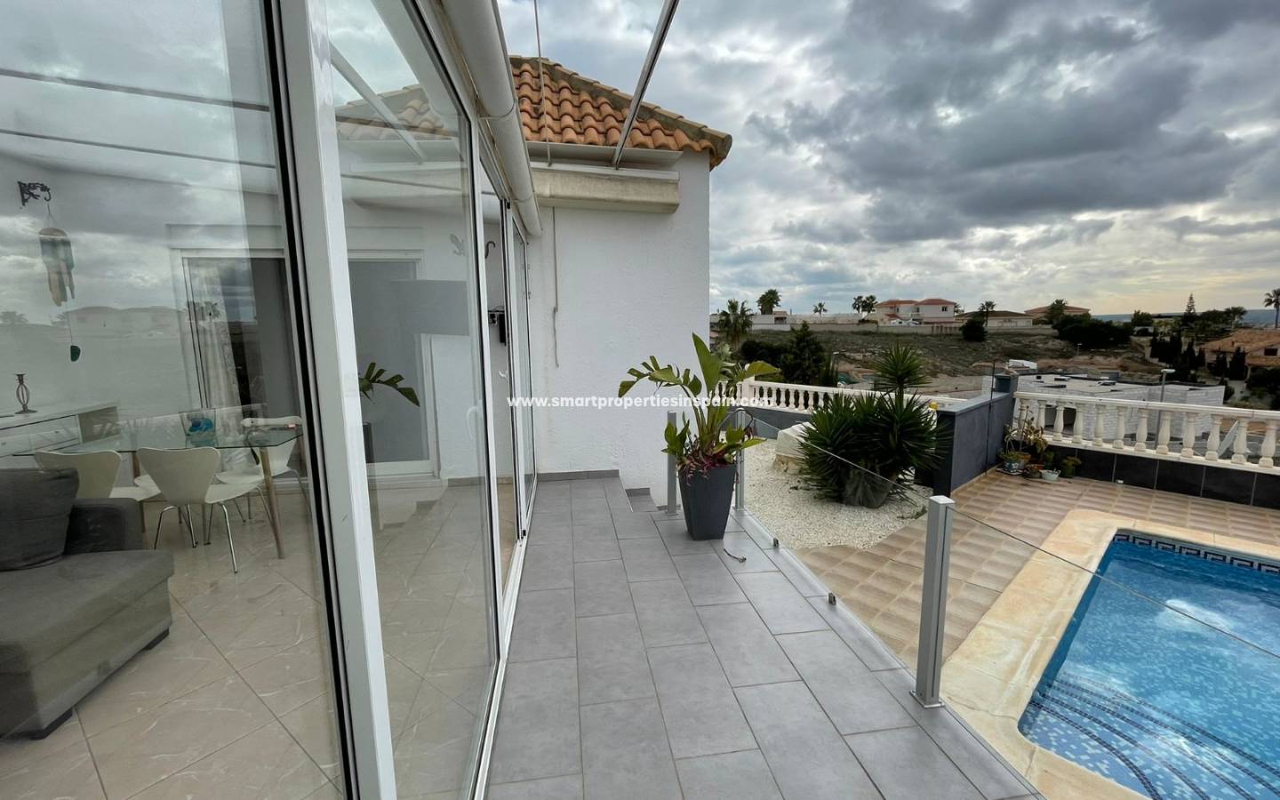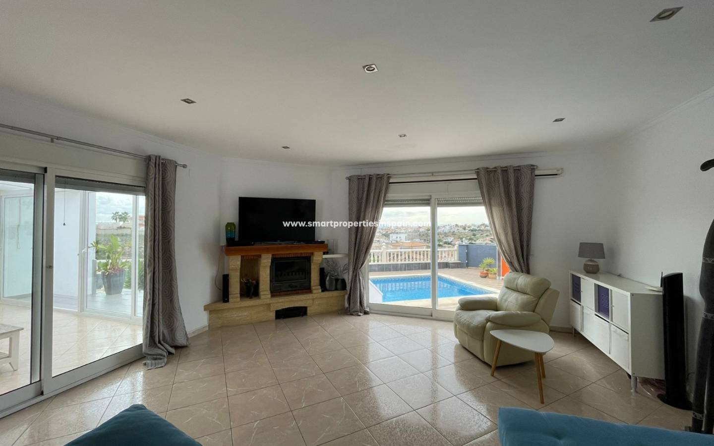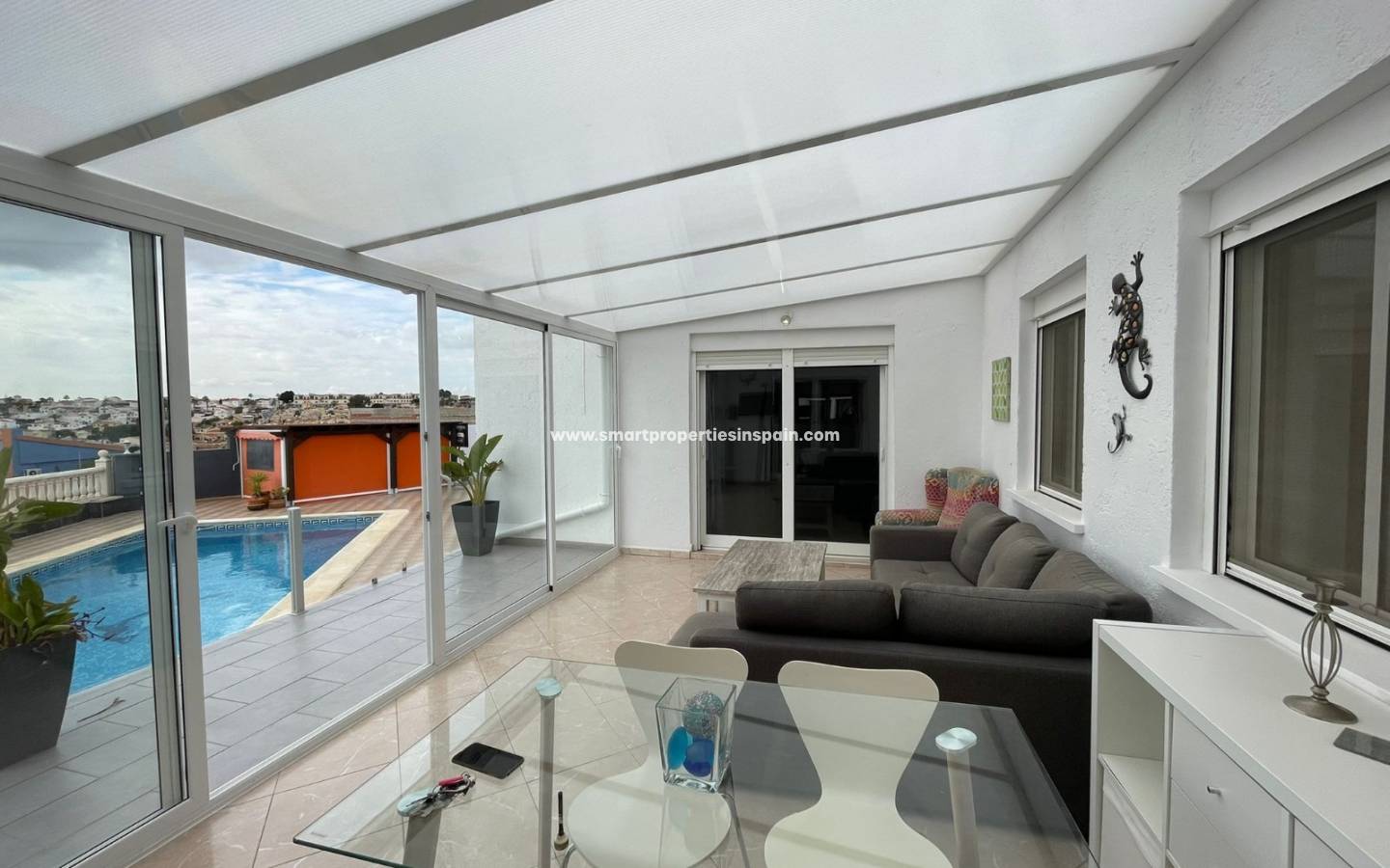 Les vues continuent dans la maison et dès que vous entrez, vous voyez les vues directement sur la piscine, il y a une cuisine ouverte, moderne et lumineuse de très bonne taille, entièrement équipée avec un coin repas qui s'ouvre sur un très spacieux, séjour lumineux qui dispose d'une cheminée, d'une grande TV mais aussi d'un projecteur de cinéma avec un écran de 3m pour regarder des films. Deux ensembles de portes coulissantes baignent la pièce avec la lumière du soleil, l'un a des escaliers menant à la piscine, l'autre porte mène à la terrasse couverte vitrée assez grande pour se prélasser et manger, mais c'est aussi un endroit très spécial pour regarder les superbes couchers de soleil d'hiver , les 2 ensembles de portes coulissantes vous mènent à une terrasse surélevée vitrée et des escaliers menant au jardin, à la piscine et à l'espace de fête.