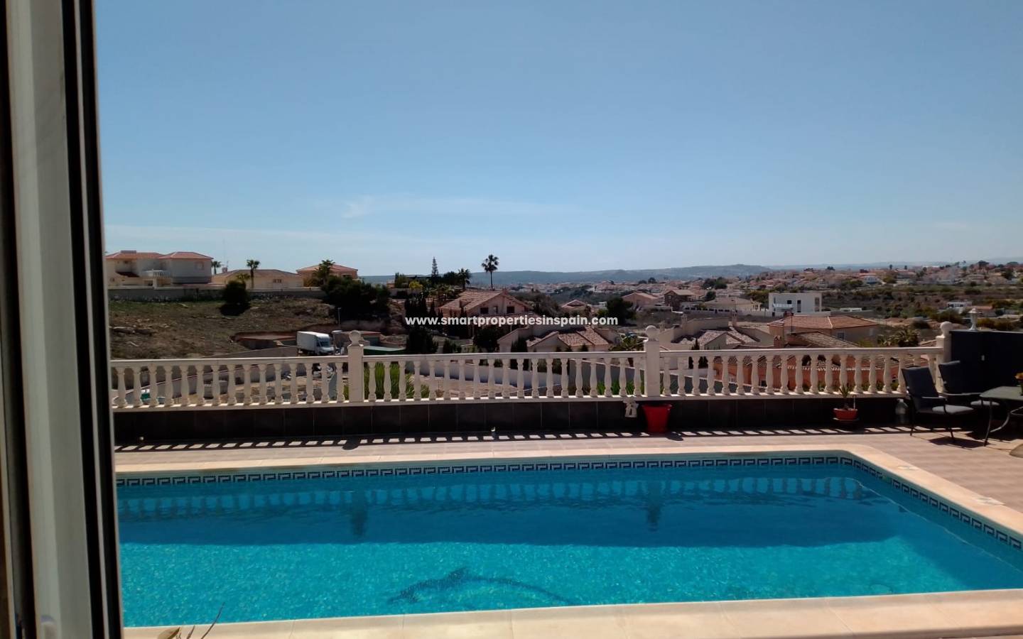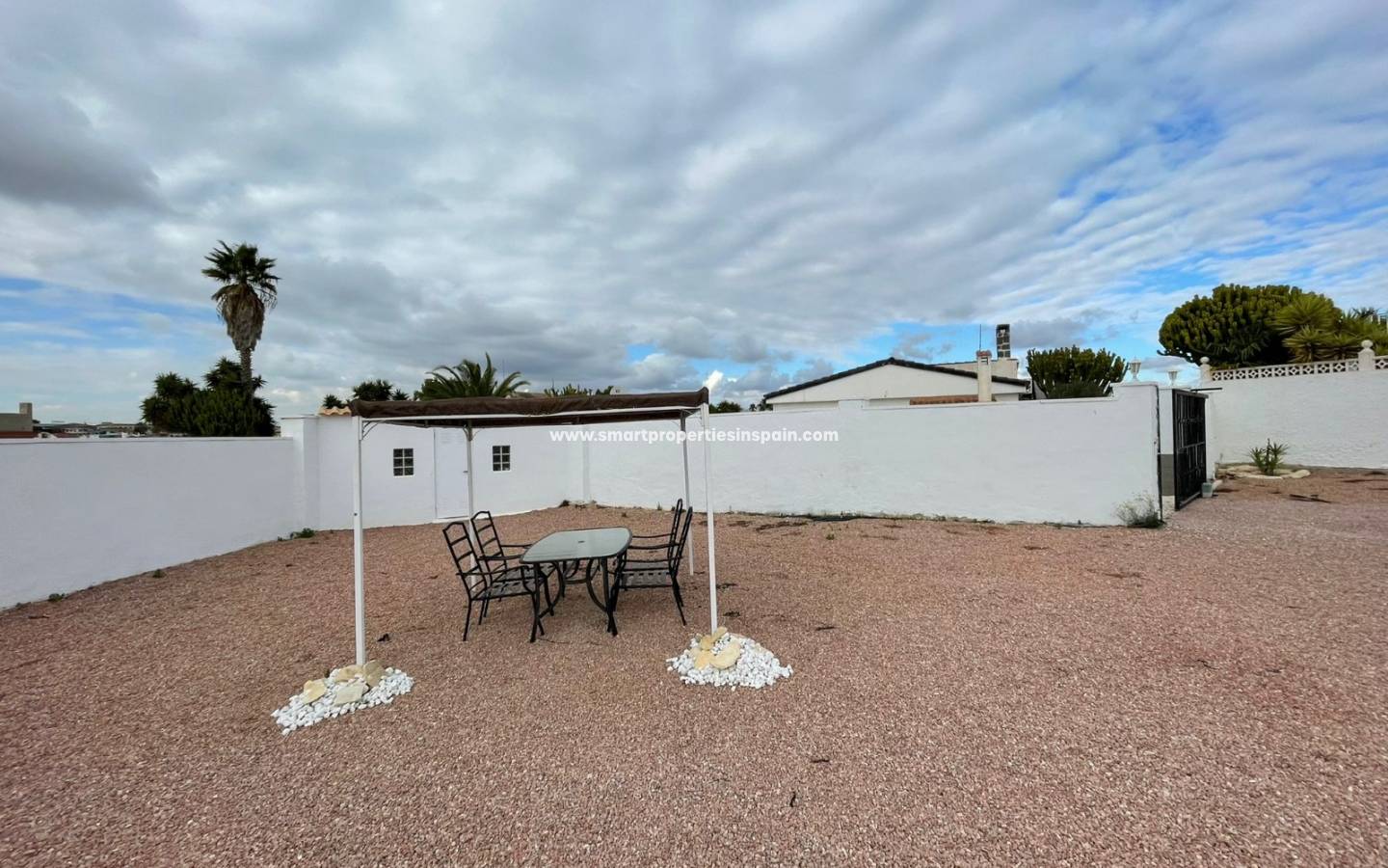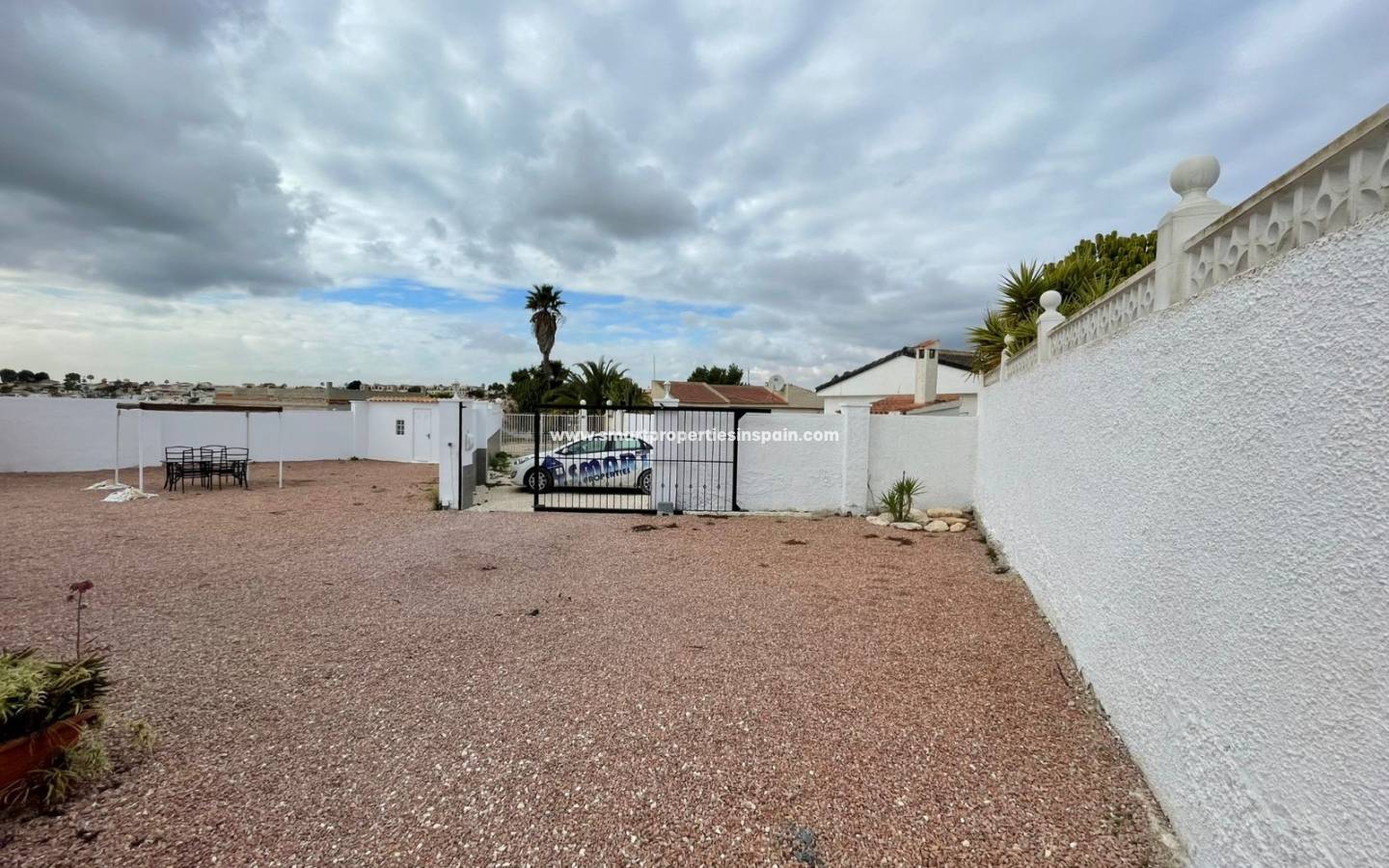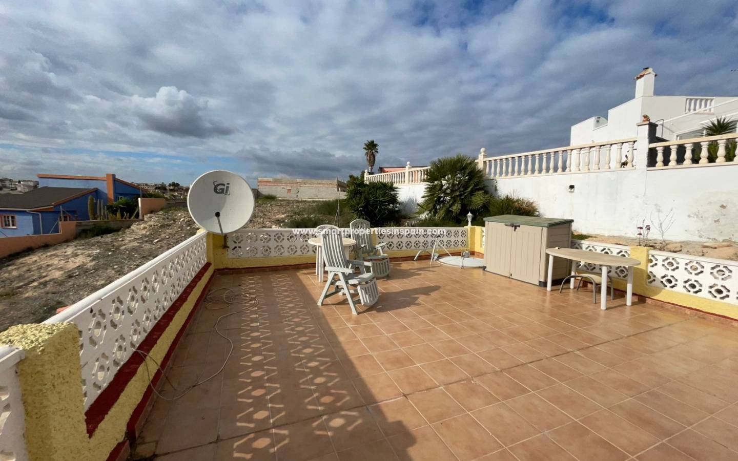 Le jardin est immense et nécessite peu d'entretien, vous pouvez également vous garer sur le terrain et à l'extérieur du portail. Il y a un escalier extérieur avec un placard de rangement sous l'électricité et une alimentation en eau qui vous mène au grand solarium d'où il y a de superbes vues à 360° qui surplombent toute l'urbanisation, les montagnes et au-delà jusqu'à la mer. L'endroit idéal pour regarder les feux d'artifice de tout le monde de près et de loin le soir du Nouvel An !