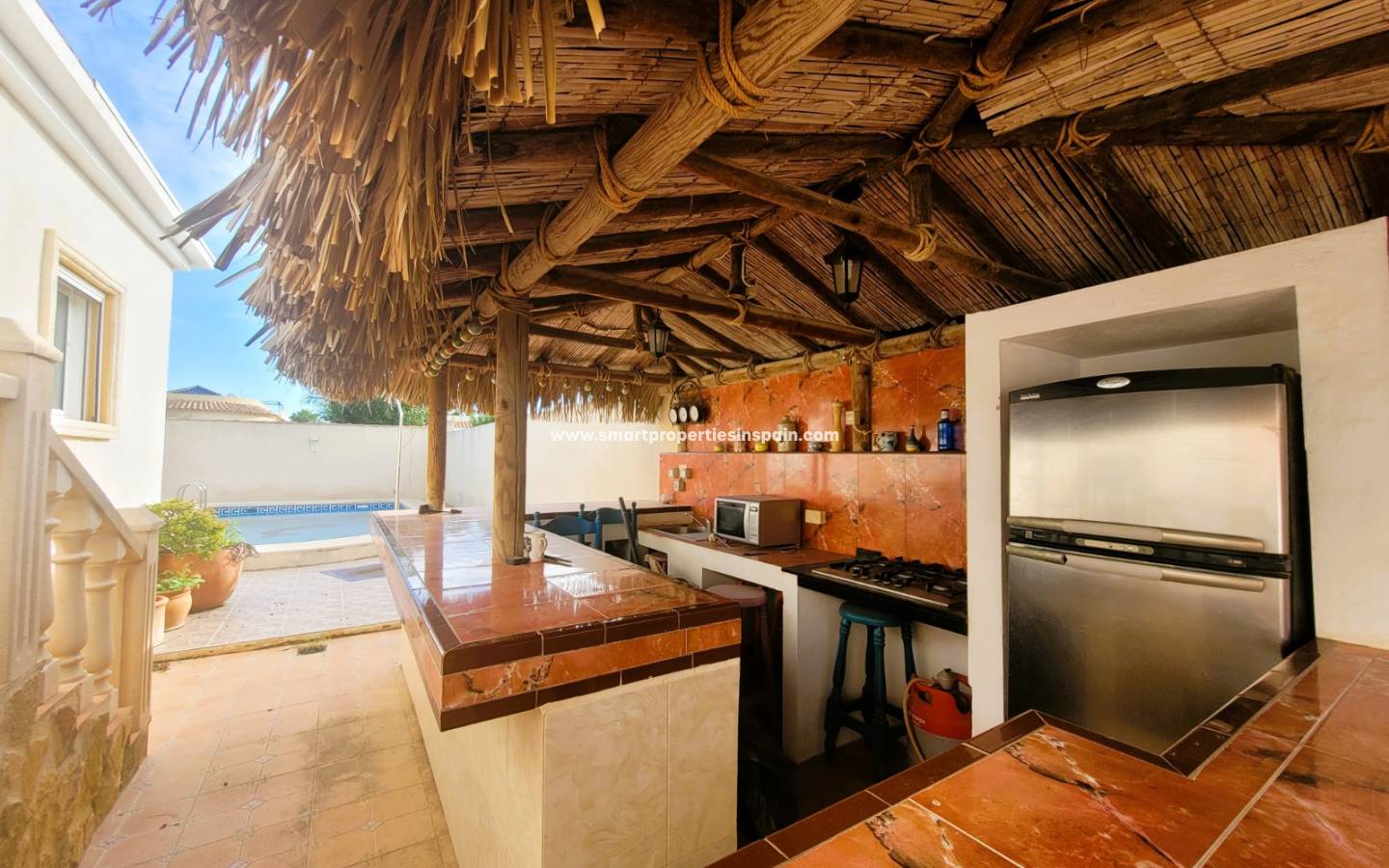 La propriété bénéficie d'un terrain de 502 m2, elle est de plain-pied et dispose de beaucoup d'espace pour profiter de la piscine privée de 8x4, qui est de très bonne taille, d'un mini bar et d'un coin barbecue pour profiter du soleil et des repas entre amis et en famille.