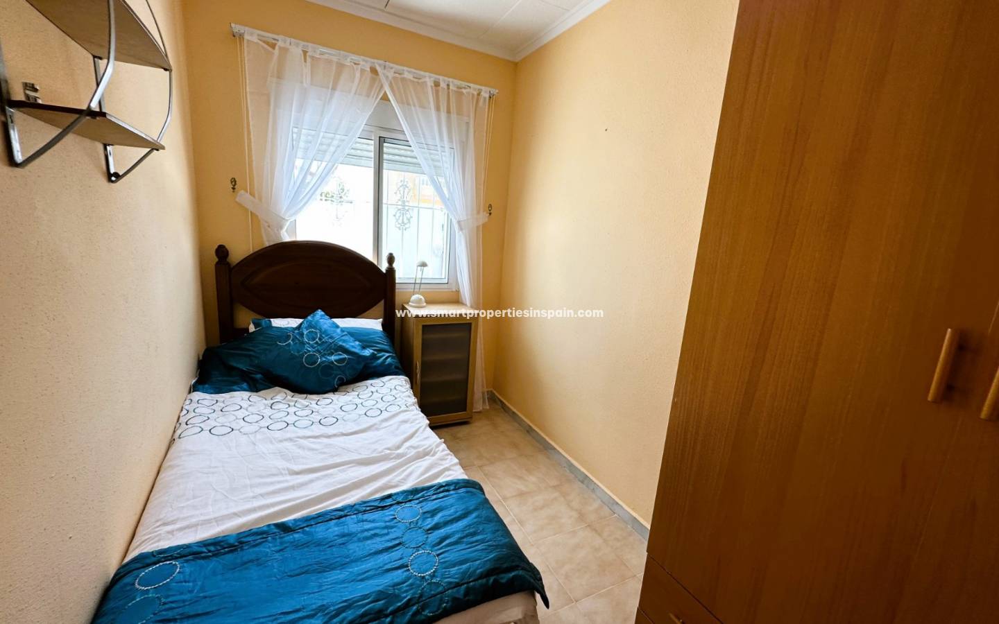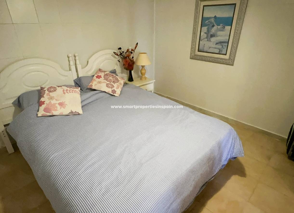 Les escaliers extérieurs nous mènent au rez-de-chaussée où nous trouvons un grand salon, une cuisine séparée, deux chambres et une salle de bain avec douche. Un espace extérieur idéal pour bronzer et manger à l'extérieur.