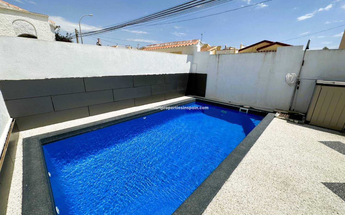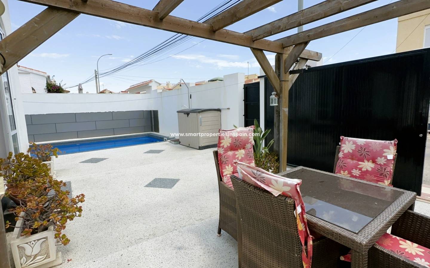 En entrant dans la propriété, nous trouvons un bel espace où nous avons une pergola avec table et chaises et une piscine de bonne taille, idéale pour organiser des repas barbecue en famille et entre amis tout en profitant du temps frais.