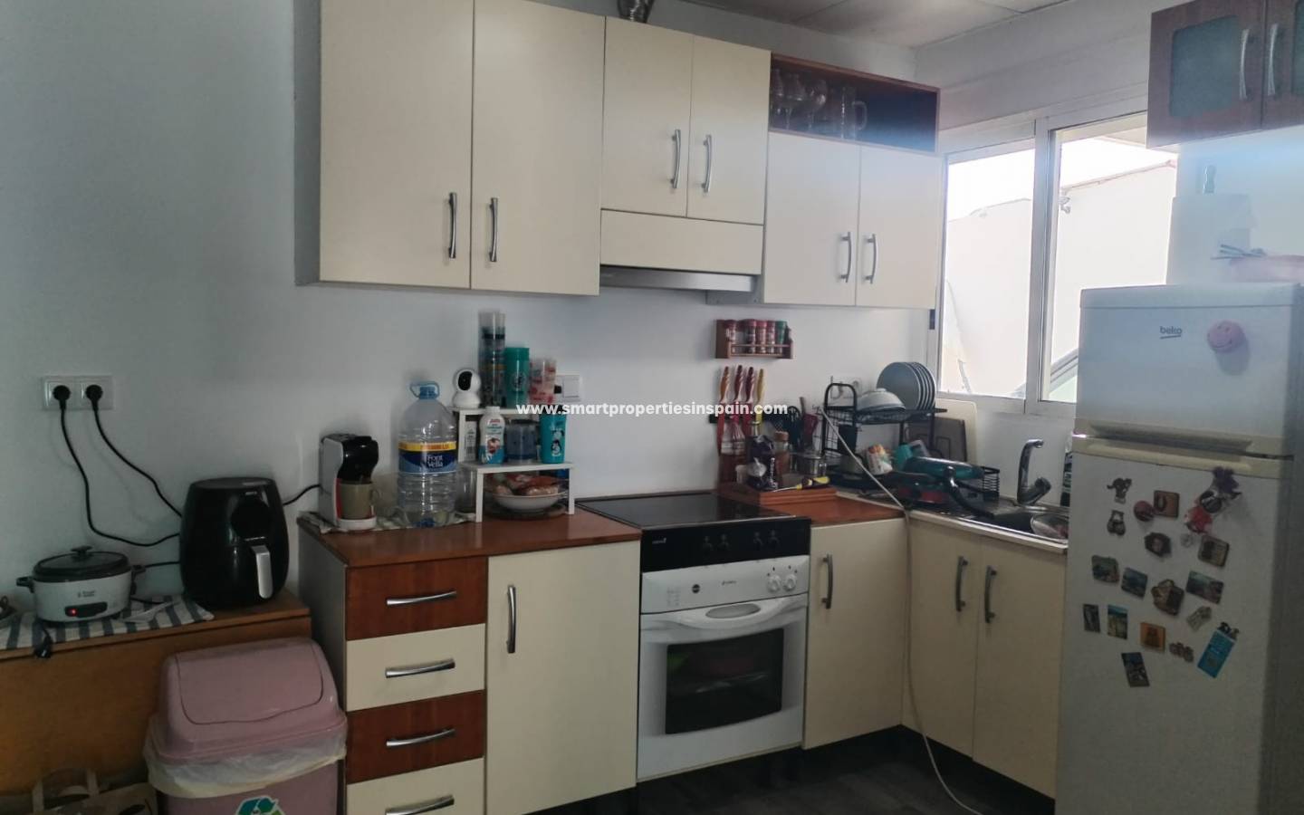 - Cuisine fonctionnelle et lumineuse : La cuisine est un espace efficace et bien pensé. Ses rangements clairs créent une atmosphère spacieuse et épurée. Le plan de travail en bois apporte une touche de chaleur naturelle. Elle est équipée d'appareils électroménagers essentiels tels qu'un four, une plaque de cuisson et un réfrigérateur , ce qui la rend parfaitement fonctionnelle dès le premier jour. Une fenêtre stratégiquement placée assure également une excellente luminosité naturelle, rendant l'espace plus agréable pour cuisiner et travailler.
