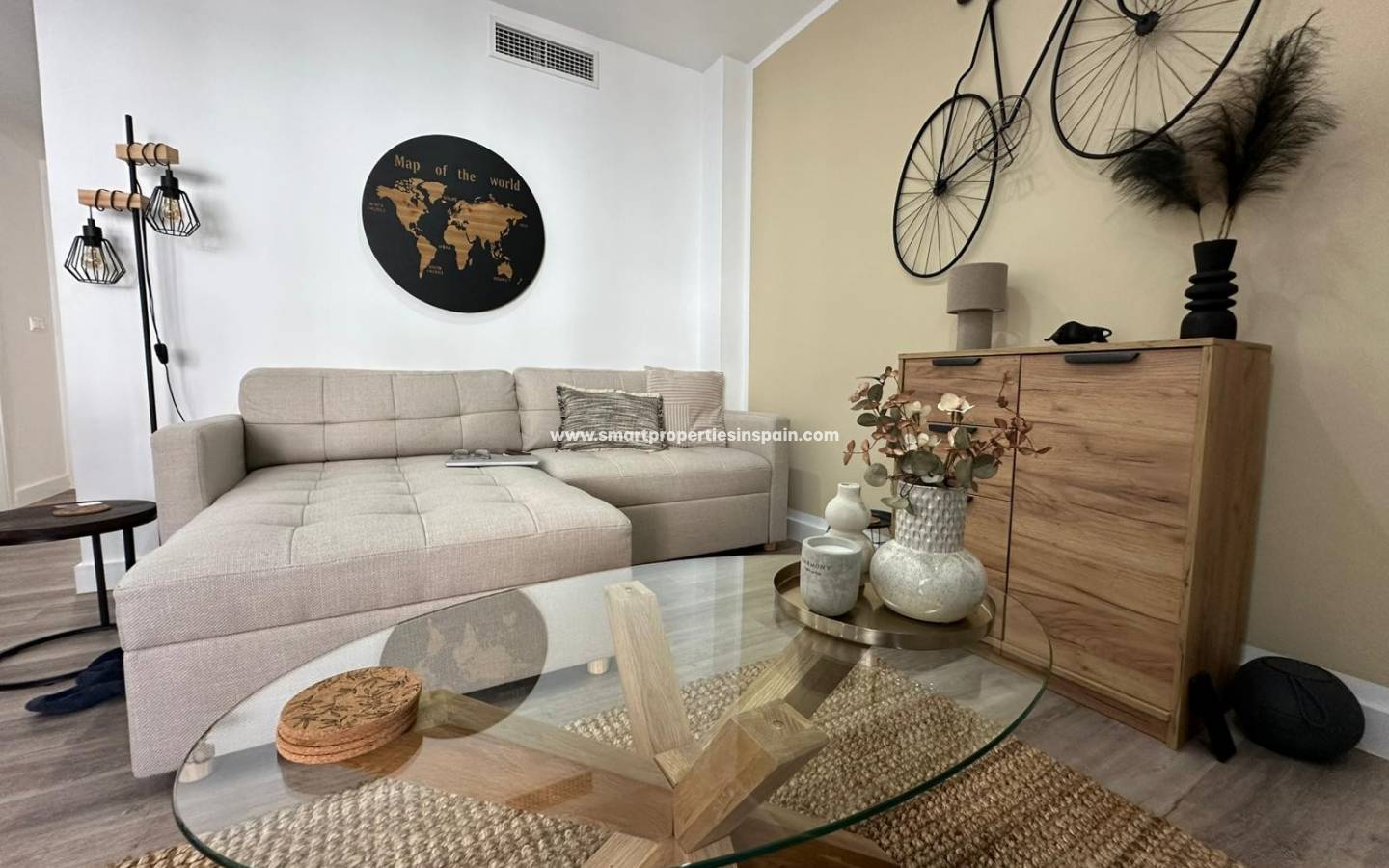 L'appartement comprend deux chambres et deux salles de bains , un séjour/salle à manger ouvert avec cuisine intégrée et un balcon vitré . Une petite terrasse est également disponible, ainsi qu'un local technique pour la machine à laver .
