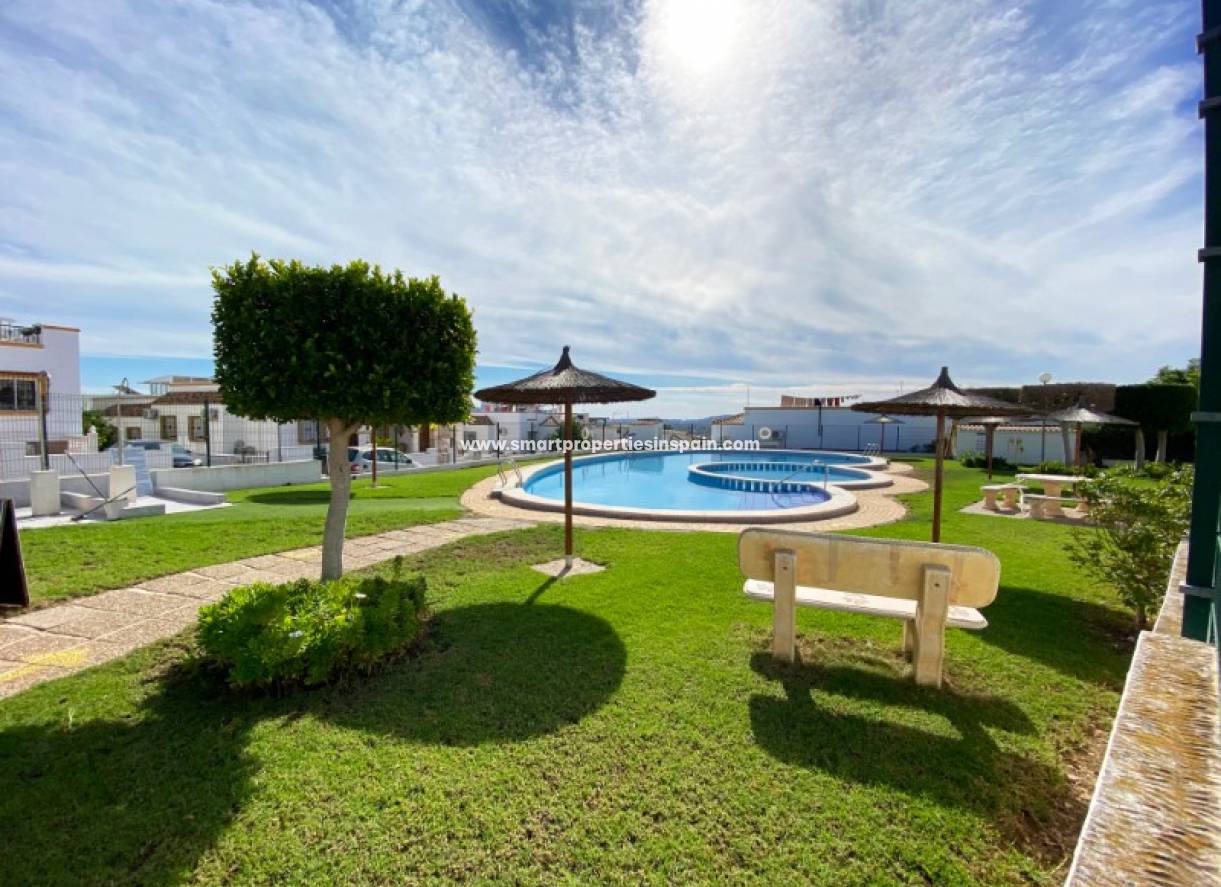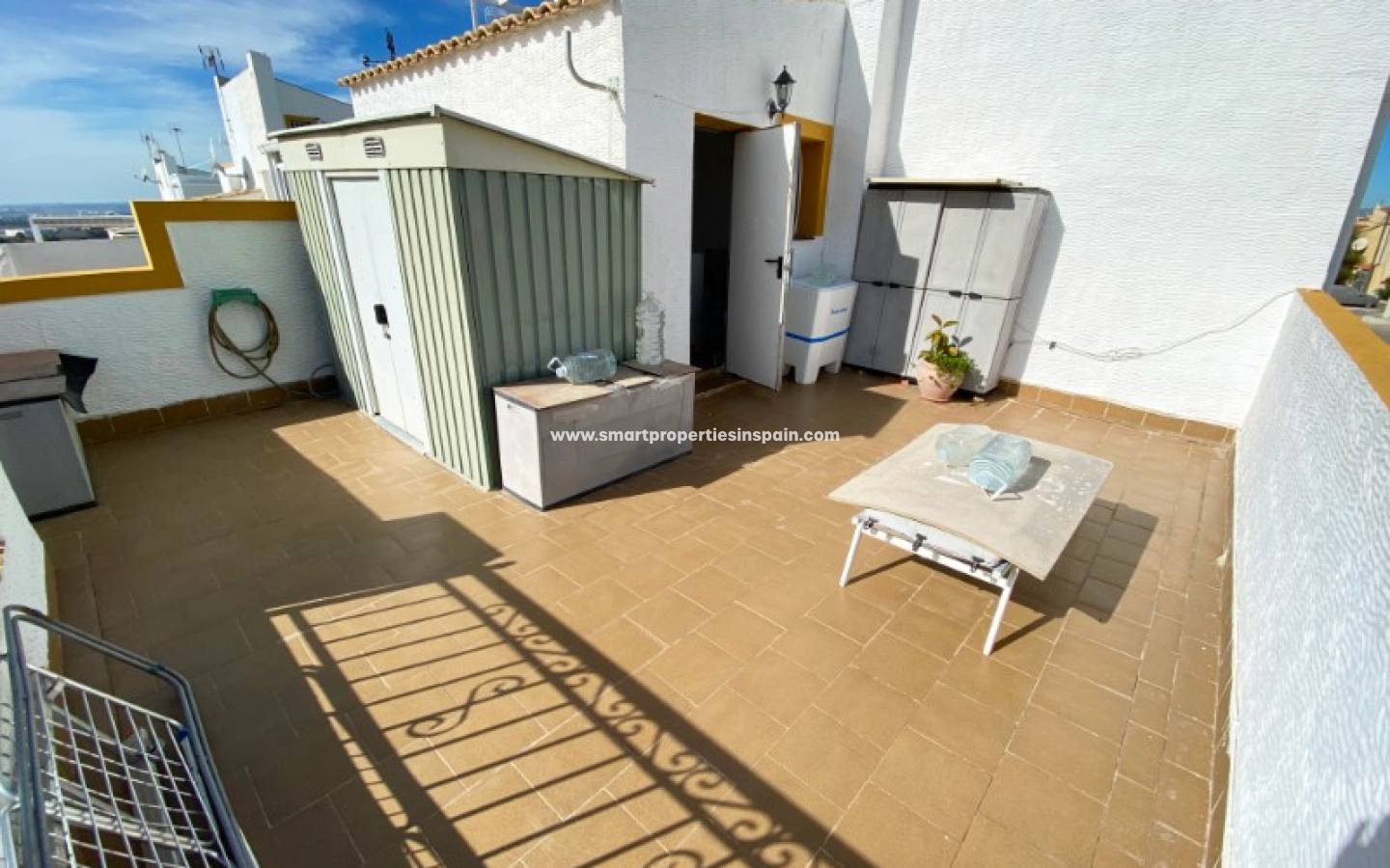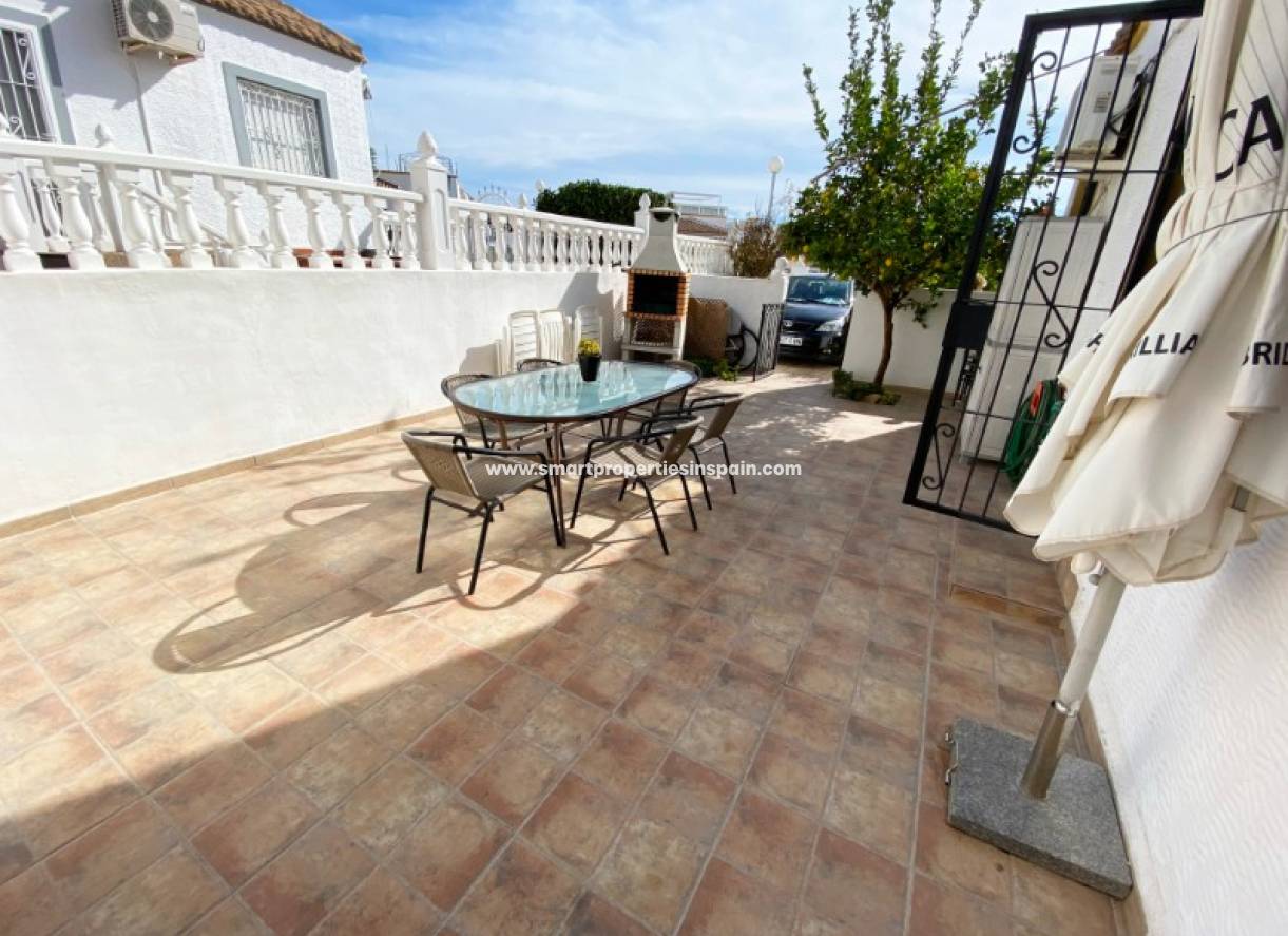 MOOIE 3 SLAAPKAMERS, 2 BADKAMERS QUAT ISABEL STIJL We zijn verheugd om deze prachtige Isabel-stijl aan te bieden op een geweldige locatie en zeer dicht bij lokale winkels, bars, restaurants en supermarkten in de urbanisatie la Marina. De smetteloze interieur accommodatie bestaat uit het volgende; over twee verdiepingen heeft de ingang een gemeubileerd verhoogd en omheind terras dat een mooie zomerkamer maakt. De voordeur komt uit in een grote mooie L-vormige woon-/eetkamer, een aparte volledig ingerichte keuken, een volledig betegelde doucheruimte en een tweepersoonsslaapkamer met inbouwkasten. Een trap leidt naar de eerste verdieping. Er zijn nog twee tweepersoonsslaapkamers met inbouwkasten en een grote volledig betegelde familiebadkamer. Vanuit de hoofdslaapkamer zijn er openslaande deuren naar een ruim terras met mooi uitzicht. Een andere trap die naar de bovenste verdieping leidt, brengt u naar een groot solarium op het dak met uitzicht op zee. Buiten is de tuin geheel betegeld, maar er zijn enkele bomen, planten en struiken, een heerlijke grote ruimte om buiten te eten. De villa ligt op slechts een korte loopafstand van het gemeenschappelijke zwembad met tuin Bezichtiging wordt sterk aanbevolen.
