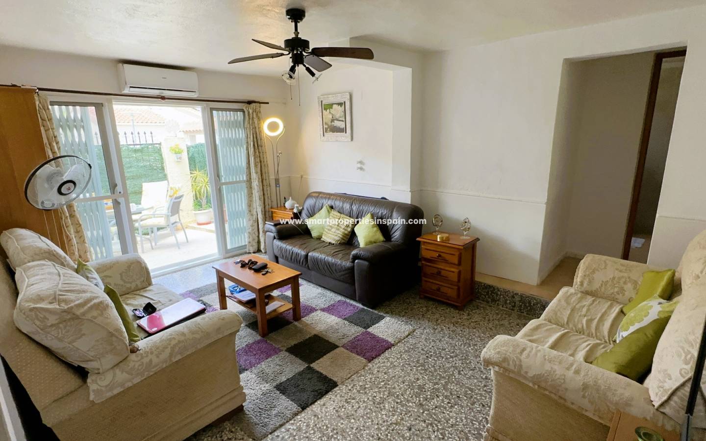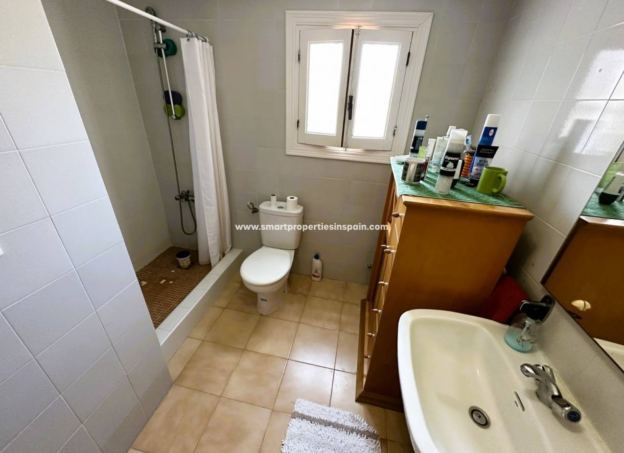 De buitentrap brengt ons naar de begane grond waar we een grote woonkamer, een aparte keuken, twee slaapkamers en een badkamer met douche vinden. Een ideale buitenruimte om te zonnen en buiten te eten.