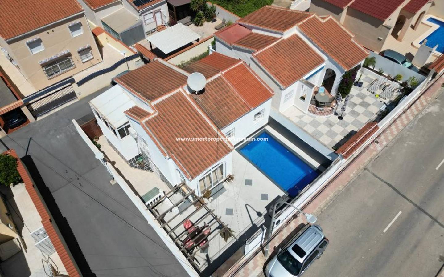 Bij het betreden van het pand vinden we een mooie ruimte met een pergola met tafel en stoelen en een groot zwembad, ideaal voor het organiseren van barbecuemaaltijden met familie en vrienden terwijl u geniet van het koele weer.