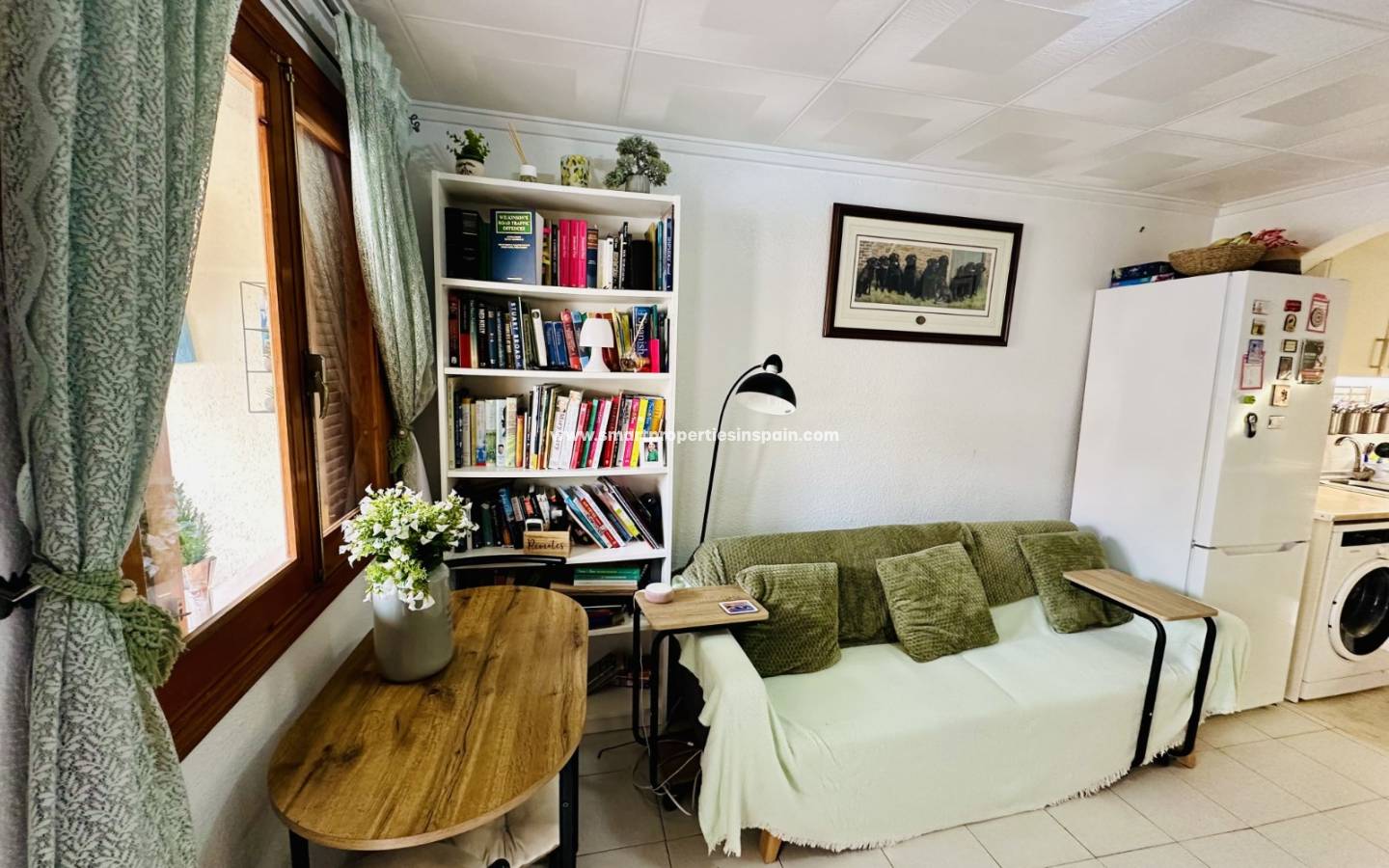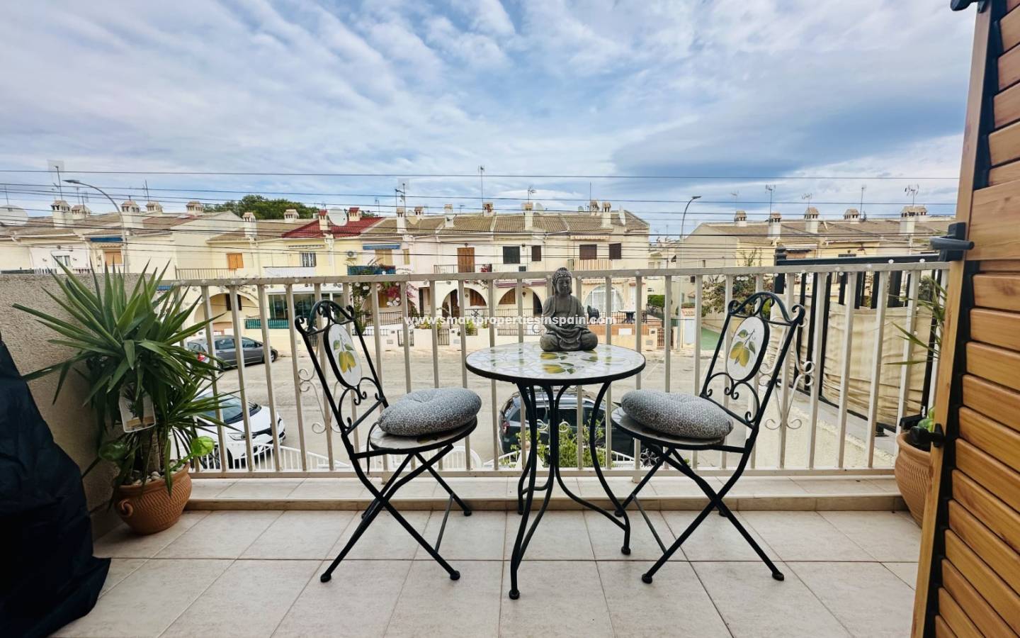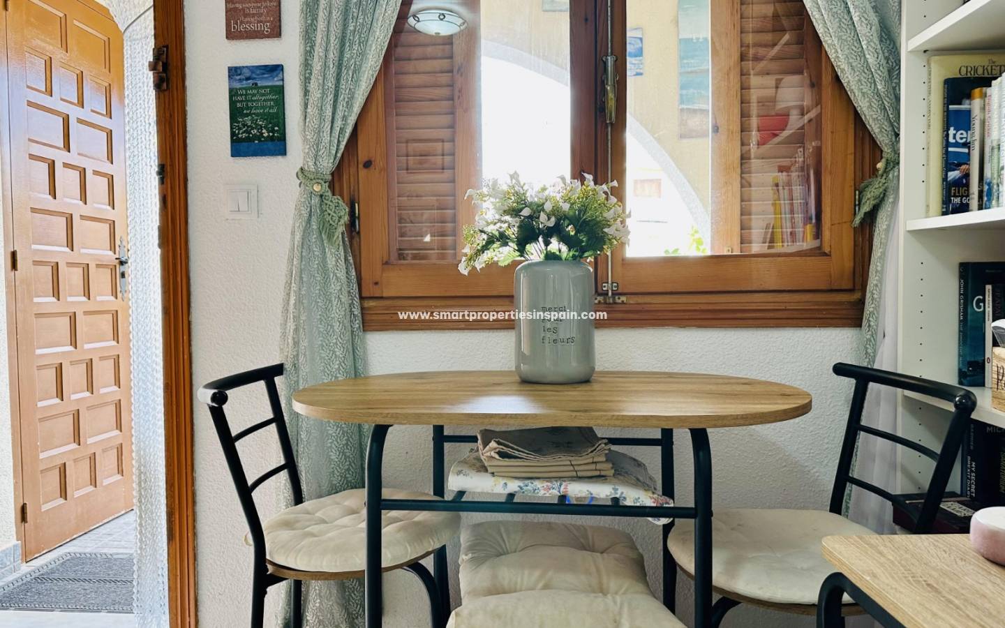 Smart Properties biedt met genoegen deze charmante woning met één slaapkamer te koop aan in de prachtige urbanisatie Buenavista in Guardamar, op slechts 600 meter van het strand. Met een woonoppervlakte van circa 53 m² beschikt de woning op de begane grond over een terras, een veranda met berging, een woonkamer met open haard en een open keuken. De marmeren trap leidt naar de bovenverdieping, waar zich nog een kleine berging, een familiebadkamer met inloopdouche, een tweepersoonsslaapkamer met inbouwkasten en nieuwe aluminium openslaande deuren met luiken bevinden die toegang geven tot een balkon met vrij uitzicht. De woonkamer en slaapkamer zijn voorzien van omkeerbare airconditioning.