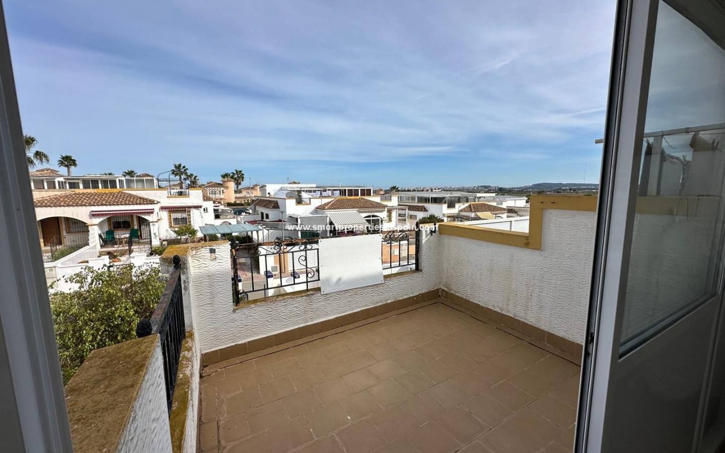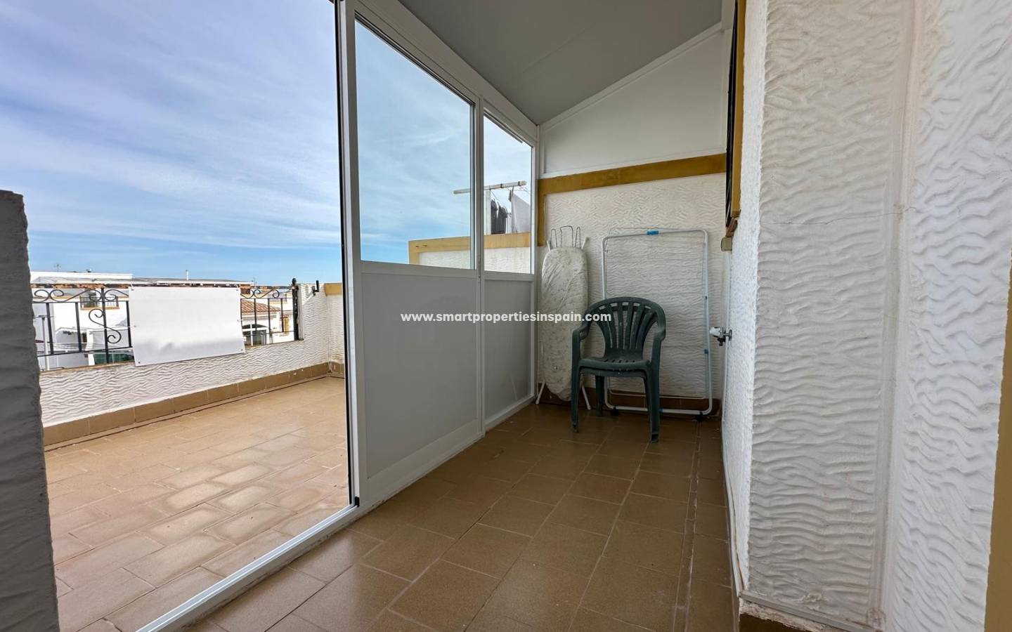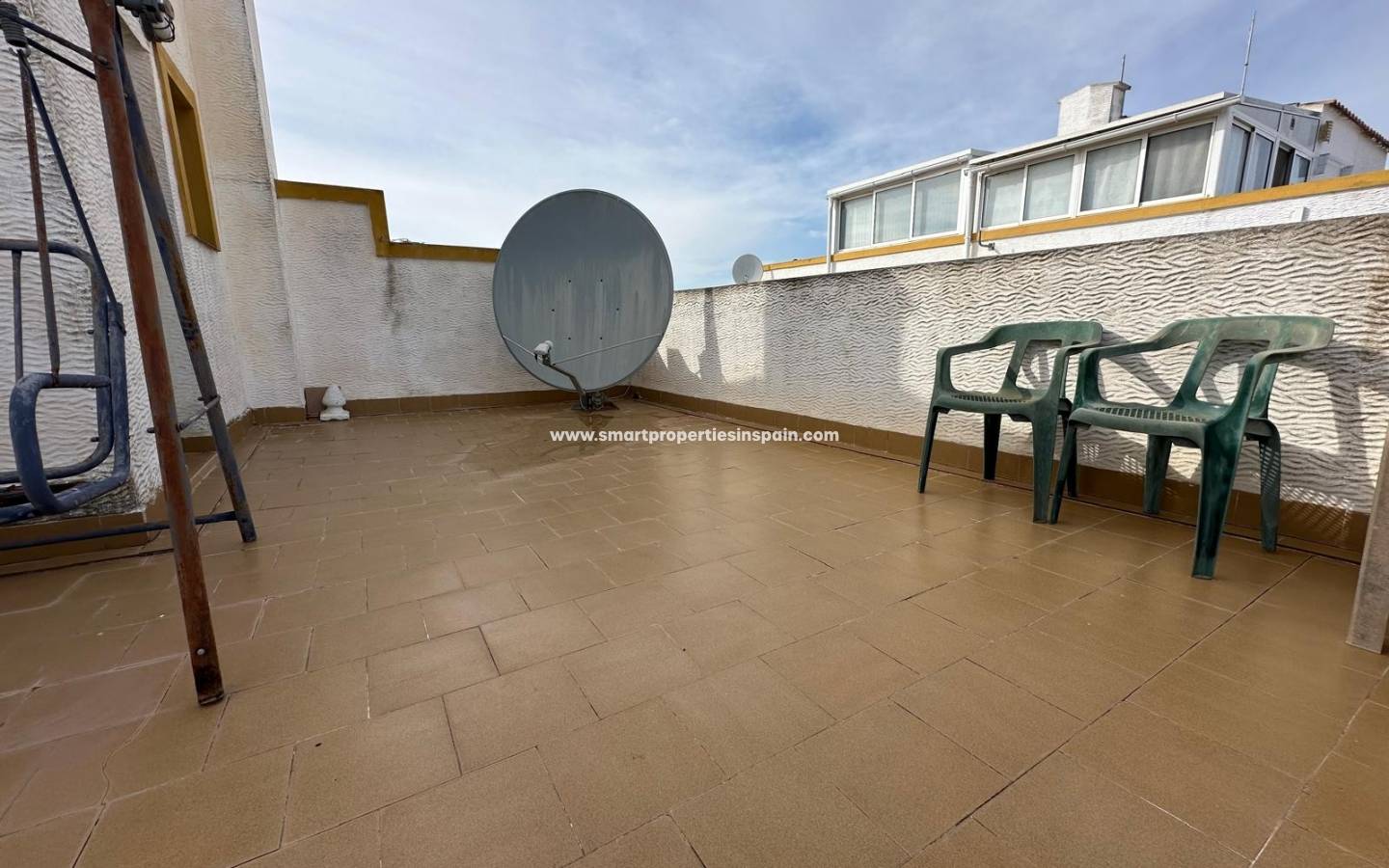Een trap in het huis leidt naar het ruime dakterras . Vanaf hier heeft men een indrukwekkend panoramisch uitzicht over het dorp en het omliggende landschap, helemaal tot aan de zee .