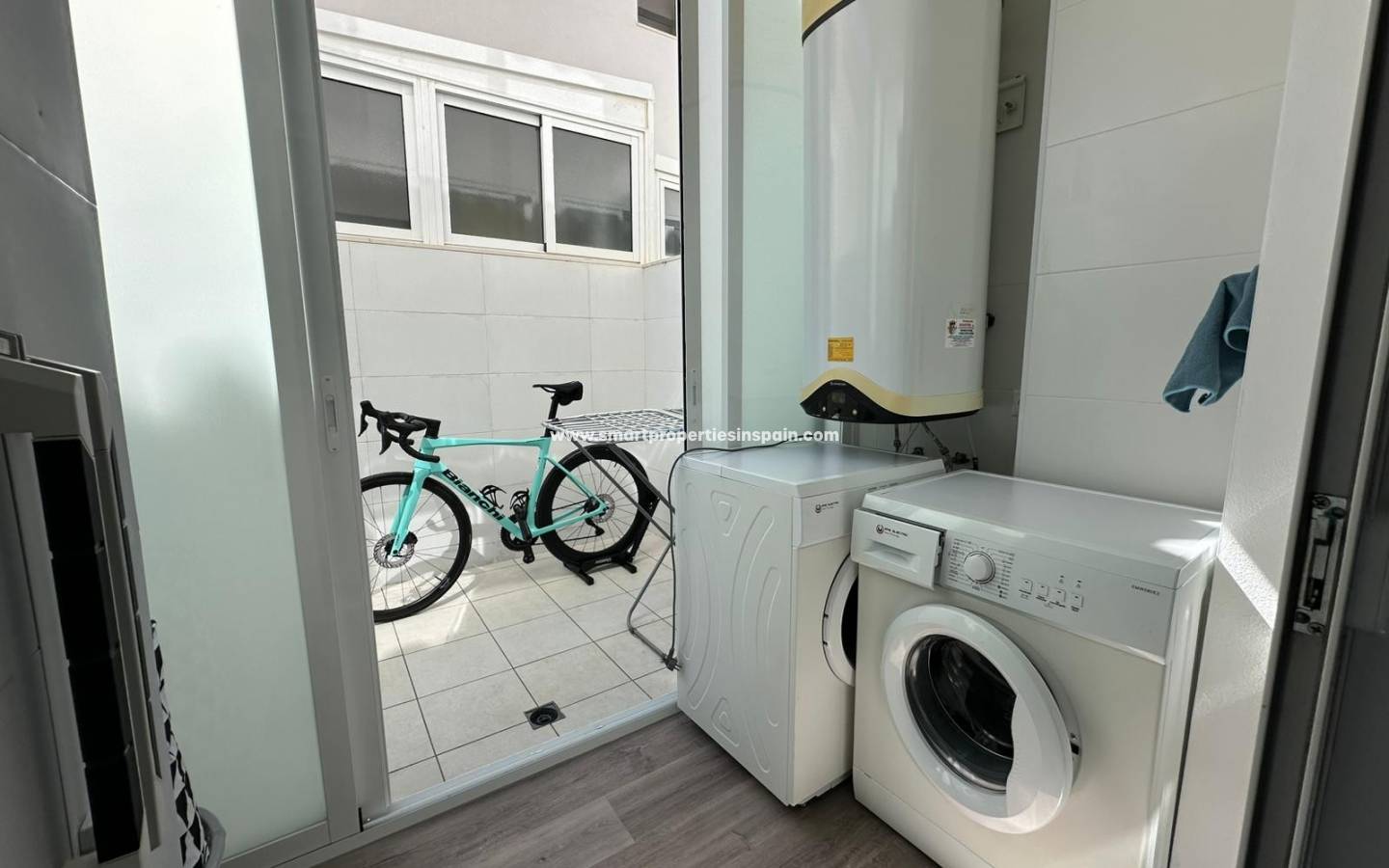 Het appartement beschikt over twee slaapkamers en twee badkamers , een open woon- en eetkamer met een geïntegreerde keuken en een glazen balkon . Er is tevens een klein terras en een handige ruimte voor de wasmachine .