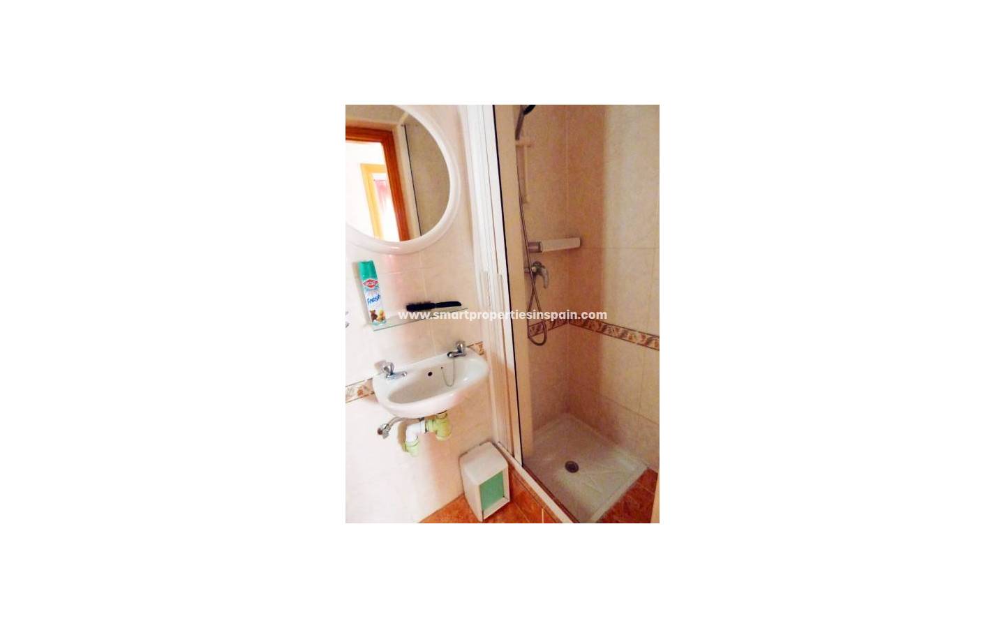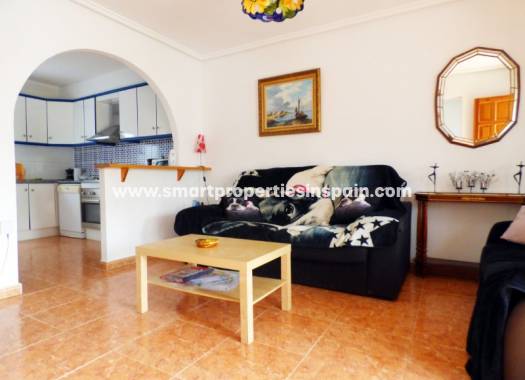 We have for long term rent this Julia-style property located in La Marina Urbanisation. The property comprises of 2 double bedrooms with fitted wardrobes, 2 bathrooms (1 en suite), a good size kitchen, a utility room, a solarium and a communal pool. This South-East facing house comes with air conditioning, security grills on all windows and off street parking is available. It is offered fully furnished. Pets are allowed.