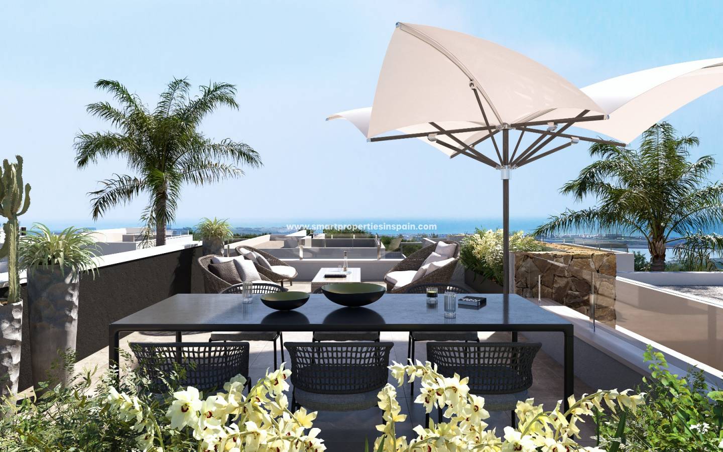 A standout feature is the spacious rooftop solarium, providing additional private outdoor space and enhancing the Mediterranean lifestyle. Solar panels can also be installed as an option.